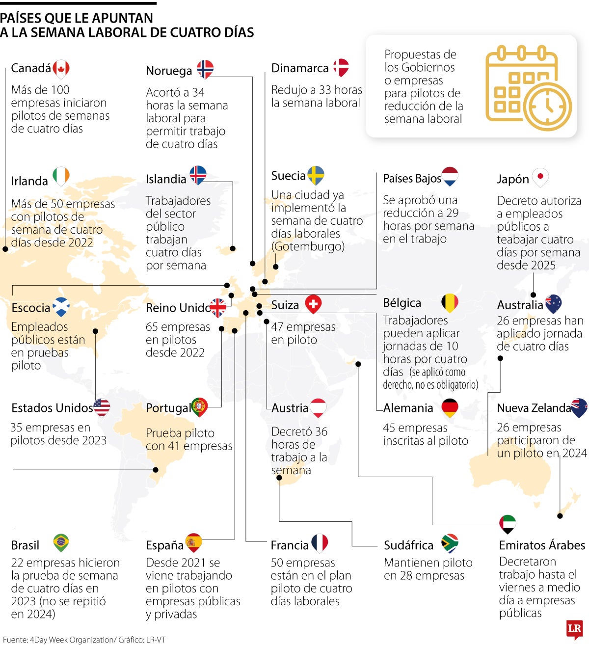 Según 4 Day Week Global, una organización que de hecho asesoró a Tokio para estructurar el plan, y que también ha estado detrás de varios pilotos en el mundo, contabilizó a un total de 26 países con programas para la semana laboral más corta (ver gráfico).