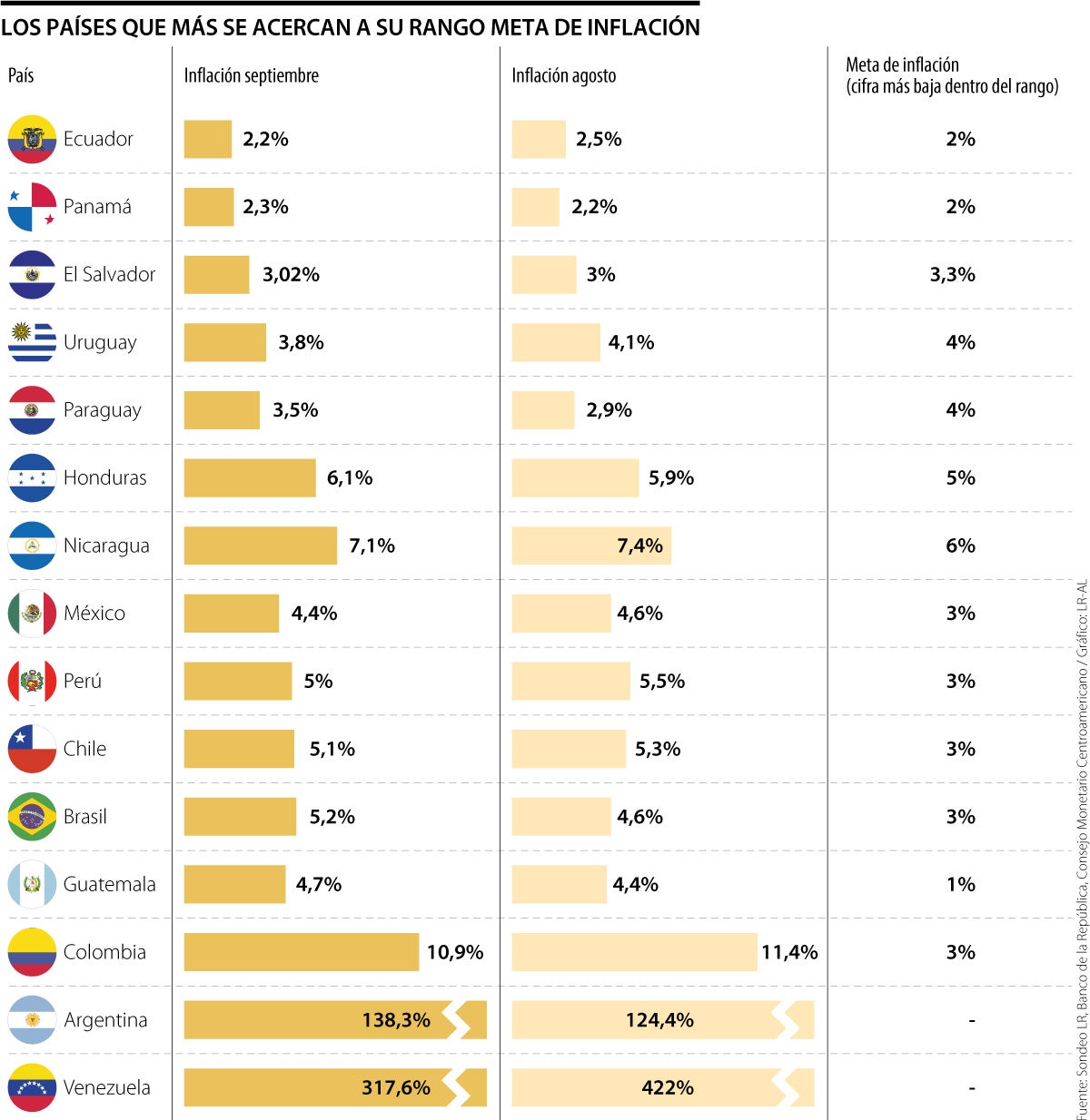 En la lista siguen Uruguay, Paraguay y Honduras como los países que más se están acercando a su rango meta de inflación fijada por el emisor. El primero registró una inflación de 3,8% en septiembre y su objetivo está en 4%. Paraguay 3,5% de tasa actual y 4% de meta, y Honduras 6,1%, con 5% de tasa idea. Luego están Nicaragua, México, Perú, Chile, Brasil, Guatemala y de últimas Colombia, pues Venezuela tienen tasas de tres dígitos, una inflación disparada en la que las metas disipan.