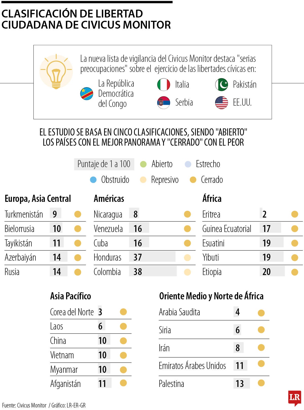 Civicus Monitor posicionó al cierre de 2024 a Colombia como el quinto peor país de todo el continente americano en materia de derechos fundamentales. En una escala de 1 a 100, la nación tiene un puntaje de 38 y está por detrás de Honduras (37); Cuba (16); Venezuela (16); y Nicaragua (8), la peor calificada de la región con ocho puntos.