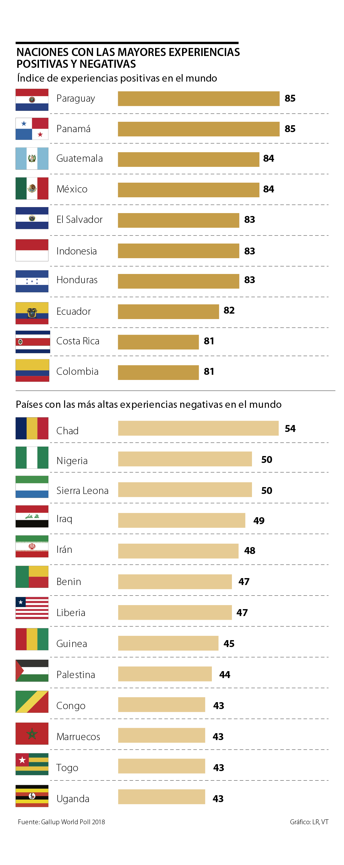 Según el informe de Gallup, las naciones que tuvieron el año pasado mayores experiencias positivas fueron: Paraguay, con un índice de 85 puntos; y le siguen Panamá (85), Guatemala (84), México (84), El Salvador (83), Indonesia (83), Honduras (83), Ecuador (82), Costa Rica (81) y Colombia (81). Indonesia es el único país que no pertenece a la región.