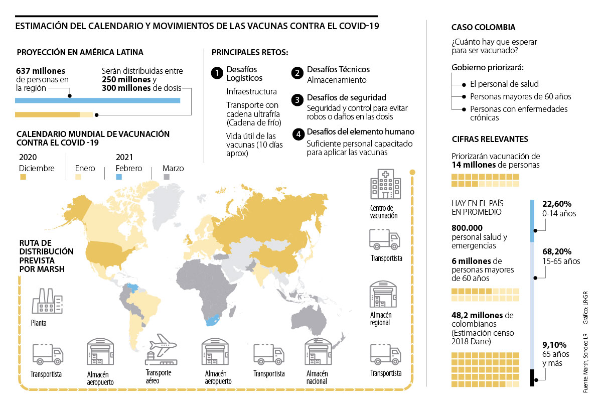Por el lado de la logística, además de la llegada de las vacunas a los países de la región, los gobiernos tendrán que enfrentar otros retos. Según comenta Marsh, firma líder global en riesgos, en uno de sus informes recientes, la burocracia, infraestructura, ciberseguridad, corrupción y robos, serían solo algunas de las dificultades que podrían retrasar el proceso.