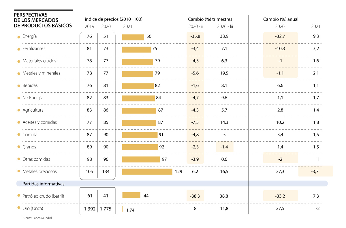 Por ahora, el Banco Mundial prevé que el precio del barril de petróleo para 2020 alcanzará los US$41, mientras que para 2021 podría llegar a los US$44. Además, señala que la demanda aumentará de manera lenta mientras se levantan las restricciones a la oferta, con lo que una segunda oleada del virus podría hacer caer los precios mucho más de lo esperado. Los precios de la energía tendrían una recuperación para 2021.