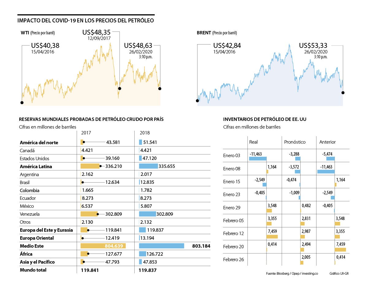 El coronavirus que se originó en China (Covid-19) no solo ha dejado a más de 81.000 personas contagiadas en alrededor de 45 países y más de 2.700 muertos en China, sino que llevó al petróleo a precios de septiembre 12 de 2017, fecha en el que el barril del WTI se cotizó en US$48,35, valor más cercano al cierre de ayer de US$48,63.
