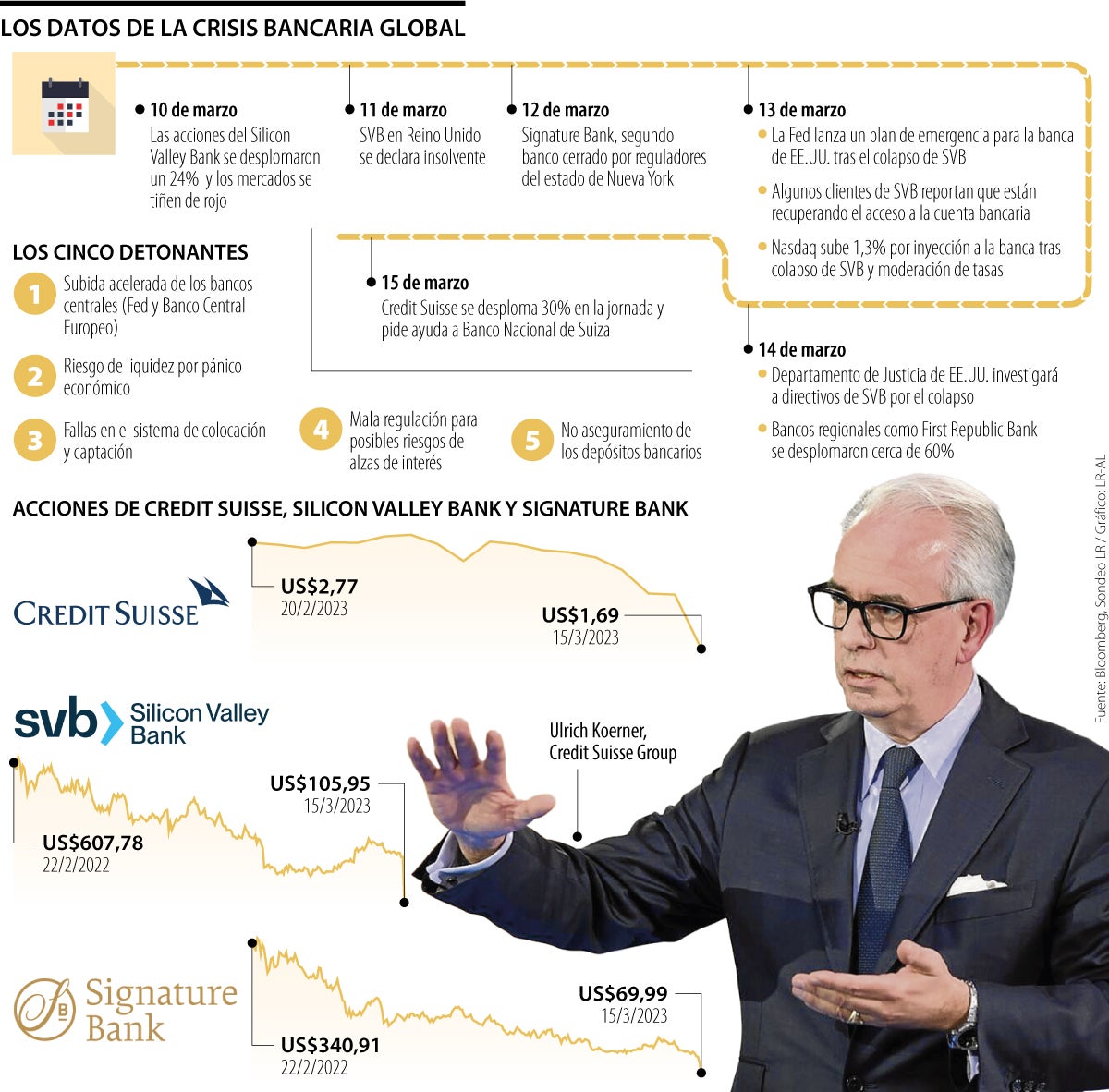 El único hilo conductor entre la crisis de Silicon Valley Bank (SVB), Signature Bank, y la crisis de Credit Suisse es la incertidumbre o el miedo global, y que sucedieron en Estados Unidos y Suiza, dos países que son emisores de moneda. Además de la acelerada subida de tasas que la Reserva Federal y el Banco Central Europeo vienen generando desde 2022 para bajar la inflación.