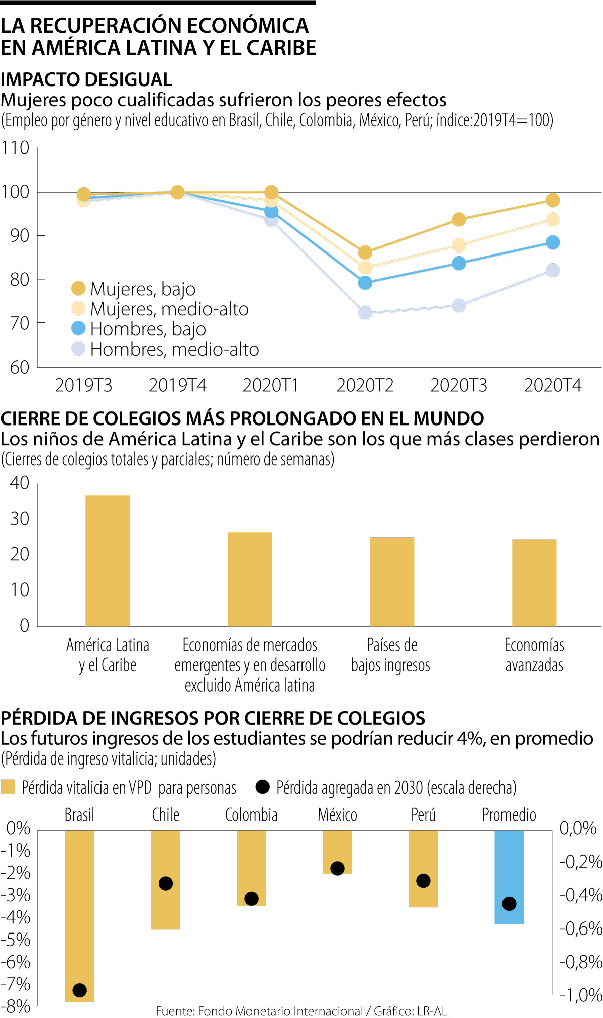 En esa misma vía, el FMI advirtió que una de las mayores consecuencias que verá la región es el deterioro permanente del capital humano debido al cierre de los colegios, que fue el más prolongado del mundo, y podría generar una reducción de hasta 4% en el ingreso vitalicio de los estudiantes entre 10 años y 19 años que dejaron de recibir clases durante 2020.