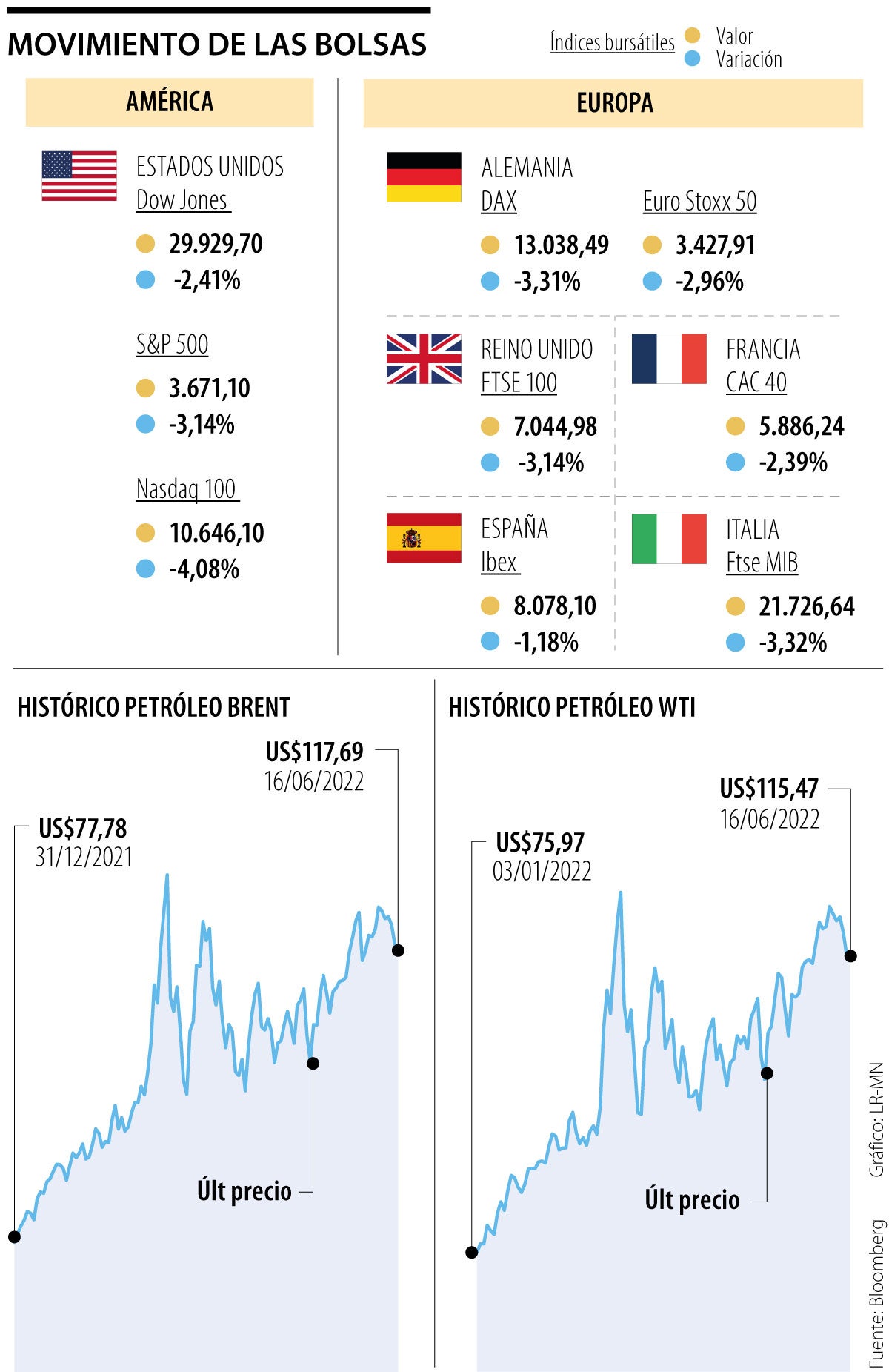 El Banco de Inglaterra también elevó ayer las tasas de interés por quinta reunión consecutiva y envió su señal más fuerte hasta el momento de que está preparado para desencadenar movimientos más grandes si es necesario para controlar la inflación. El Ftse 100 de la Bolsa de Londres bajó 3,14% y la libra se debilitó.