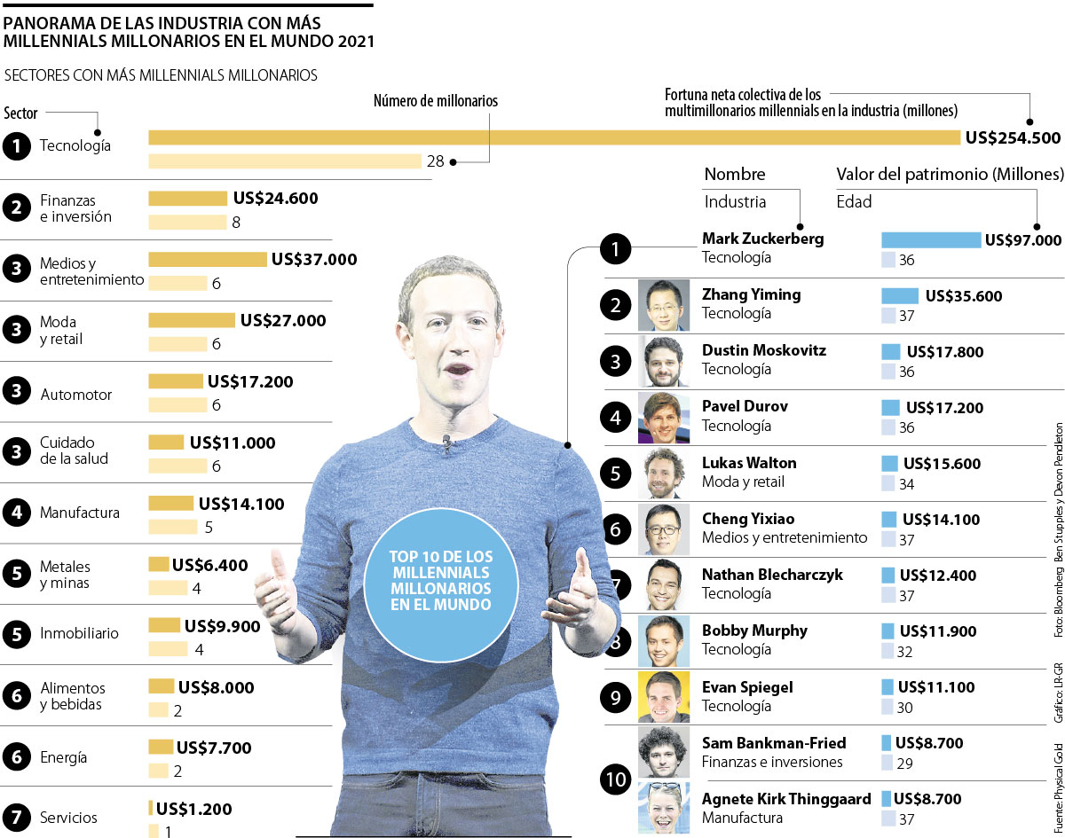 Teniendo claro los sectores, el informe también destacó a los 10 millennials más ricos del mundo. En ese listado destacó en primer lugar, y con mucha distancia sobre el segundo, el creador de Facebook, Mark Zuckerberg, que con una fortuna de US$97.000 millones es el millennial con mayor fortuna, a sus 36 años.