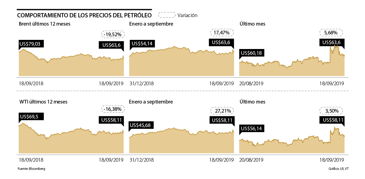 El primero de ellos es el alza en los precios del petróleo. El ataque a Aramco afectó la mitad de su producción y hasta 5% del suministro global, lo que lleva a un alza en los precios por temor a una menor oferta de crudo. Aunque ayer el Brent cayó 1,5% a US$63,60 el barril y WTI bajó 2,1%, a US$58,11, en lo corrido del año el precio de ambas referencias ha venido subiendo: 17,47% el Brent y 27,21% el WTI. Si solo se analiza el mes, el aumento es de 3,50% y 5,68%, respectivamente.