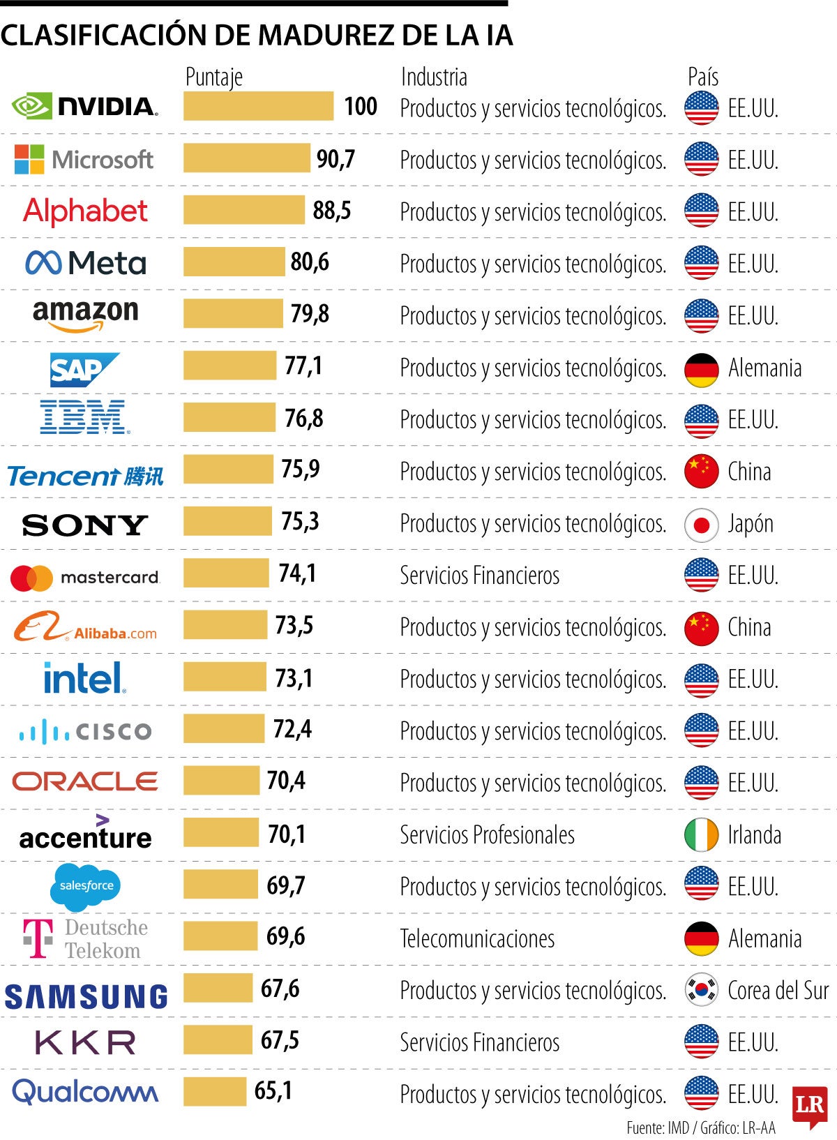 En esta edición, Nvidia lidera el ranking, seguida por Microsoft y Alphabet, reflejando el protagonismo del sector tecnológico en el desarrollo y escalamiento de sistemas avanzados. El índice evalúa a las mayores compañías del mundo según cinco aspectos fundamentales: el compromiso de sus equipos directivos, la inversión en infraestructura tecnológica, la integración de la IA en procesos internos, el desarrollo de capacidades en la fuerza laboral y la existencia de marcos sólidos de gobernanza ética. El objetivo es medir hasta qué punto la IA se ha convertido en un elemento estructural dentro de la organización y no solo en un conjunto de proyectos aislados.