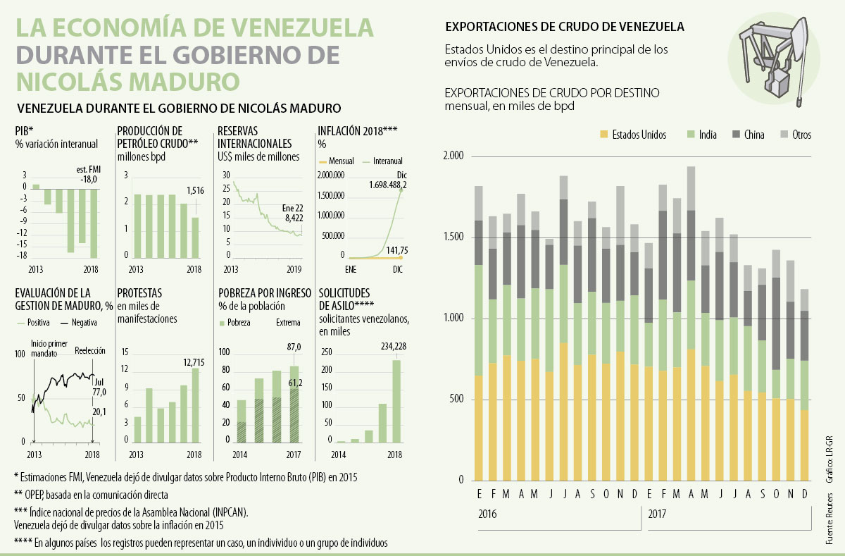 Por un lado, el régimen chavista enfrenta el cerco económico del bloque occidental, que desembocó en la pérdida sobre el control de las reservas nacionales, el congelamiento de US$7.000 millones en activos de Pdvsa y la alerta de EE.UU. de no viajar al país por temas de seguridad. Por el otro, el presidente interino, Juan Guaidó, enfrenta la prohibición de salir del país y la congelación de sus cuentas bancarias.