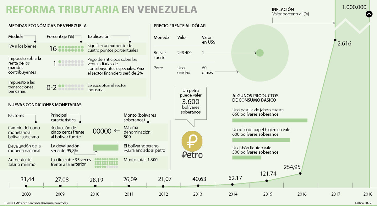 Pese a que el Gobierno de Venezuela implementó el Bolívar soberano como nuevo cono monetario con el propósito de reducir cinco ceros al bolívar fuerte y aumentar el poder adquisitivo de los venezolanos, la situación económica está lejos de mejorar. Mientras que los productos básicos aún mantienen precios elevados, el presidente Nicolás Maduro anunció un nuevo impuesto al valor agregado (IVA) de 16%, un impuesto sobre la renta de 1% y un tributo a las transacciones bancarias de entre 0% y 2%.