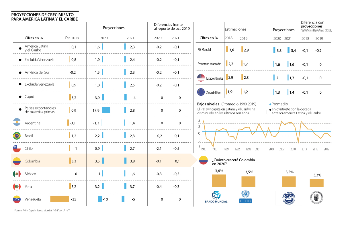 Para Colombia, el FMI pronosticó un crecimiento de 3,5% en el PIB este año, la cifra representó una disminución de 0,1 puntos respecto al pronóstico entregado en octubre de 2019, en el que ubicaban un crecimiento de 3,6%.
