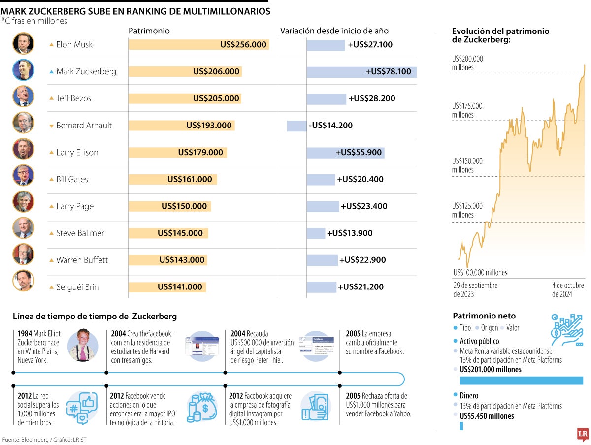 Zuckerberg, que posee 13% de la participación en la compañía con sede en Menlo Park, California, ha visto su fortuna crecer US$78.000 millones en lo que va del año, la mayor cantidad de las 500 personas más ricas del mundo. El cofundador y director ejecutivo de 40 años ha ganado cuatro puestos este año en el índice de riqueza.