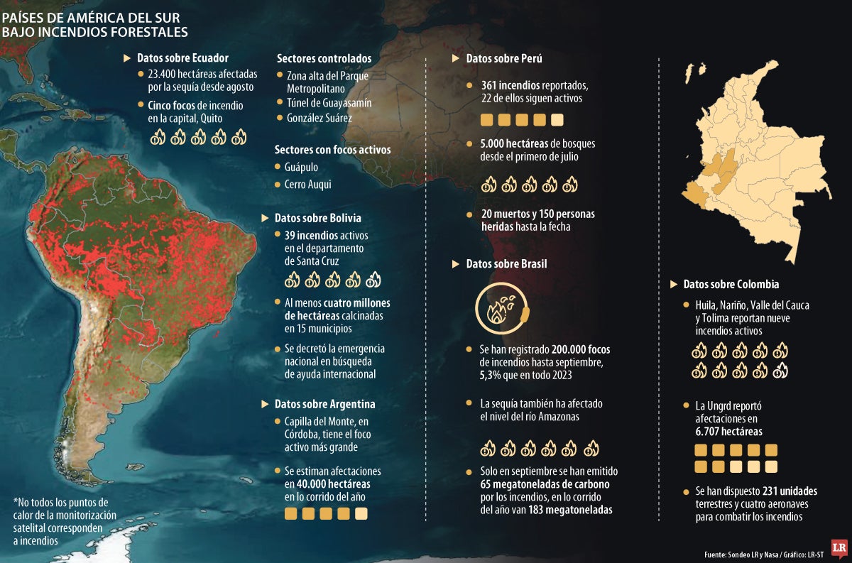Fruto de la sequía y de las altas temperaturas que se viven en Ecuador, Argentina, Brasil, Perú y Bolivia,se han avivado las llamas en más de 4.000 puntos clave de estos países como Quito, Córdoba y la Amazonía.