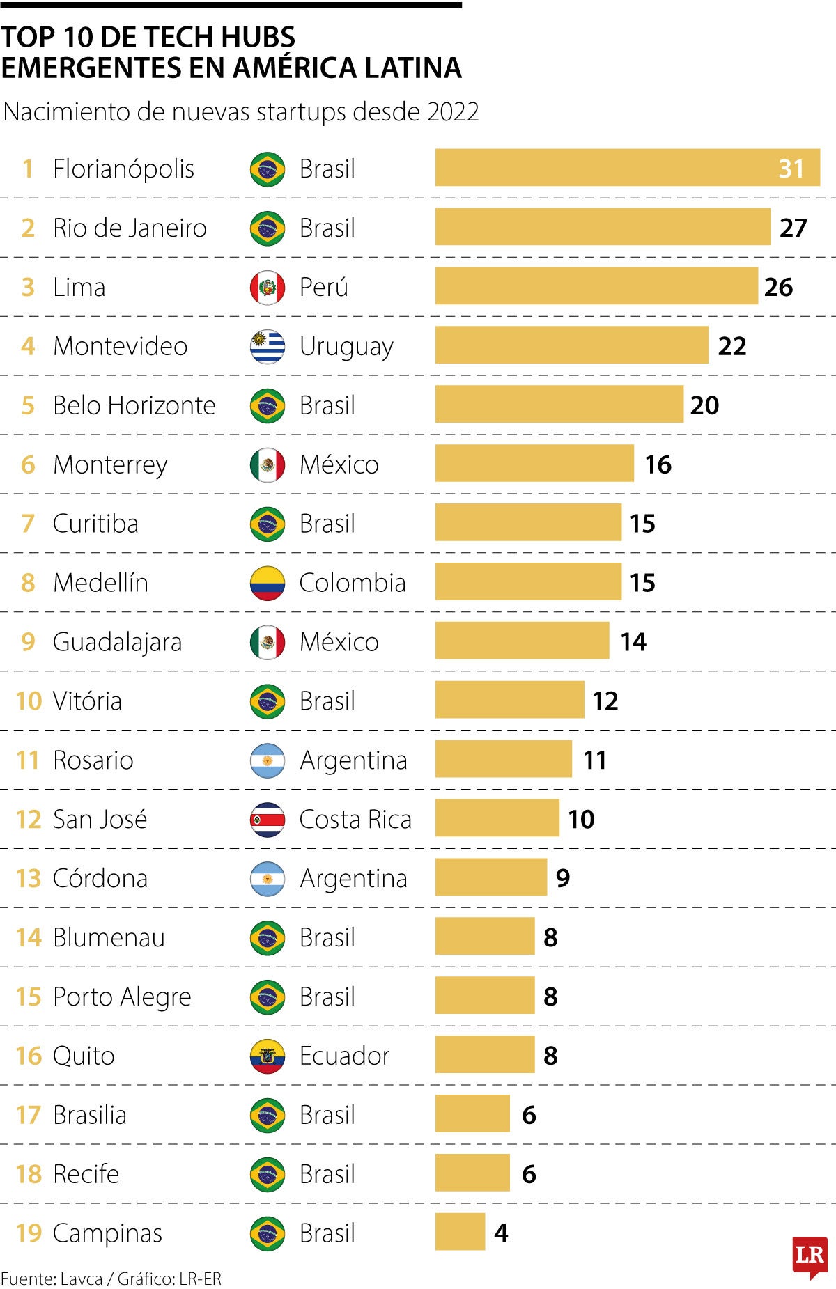 Más de la mitad de las ciudades hub tech del ranking de Lavca, 10, son de Brasil, lo que ubica al país como principal epicentro regional de empresas tecnológicas impulsadas con capital de riesgo.
