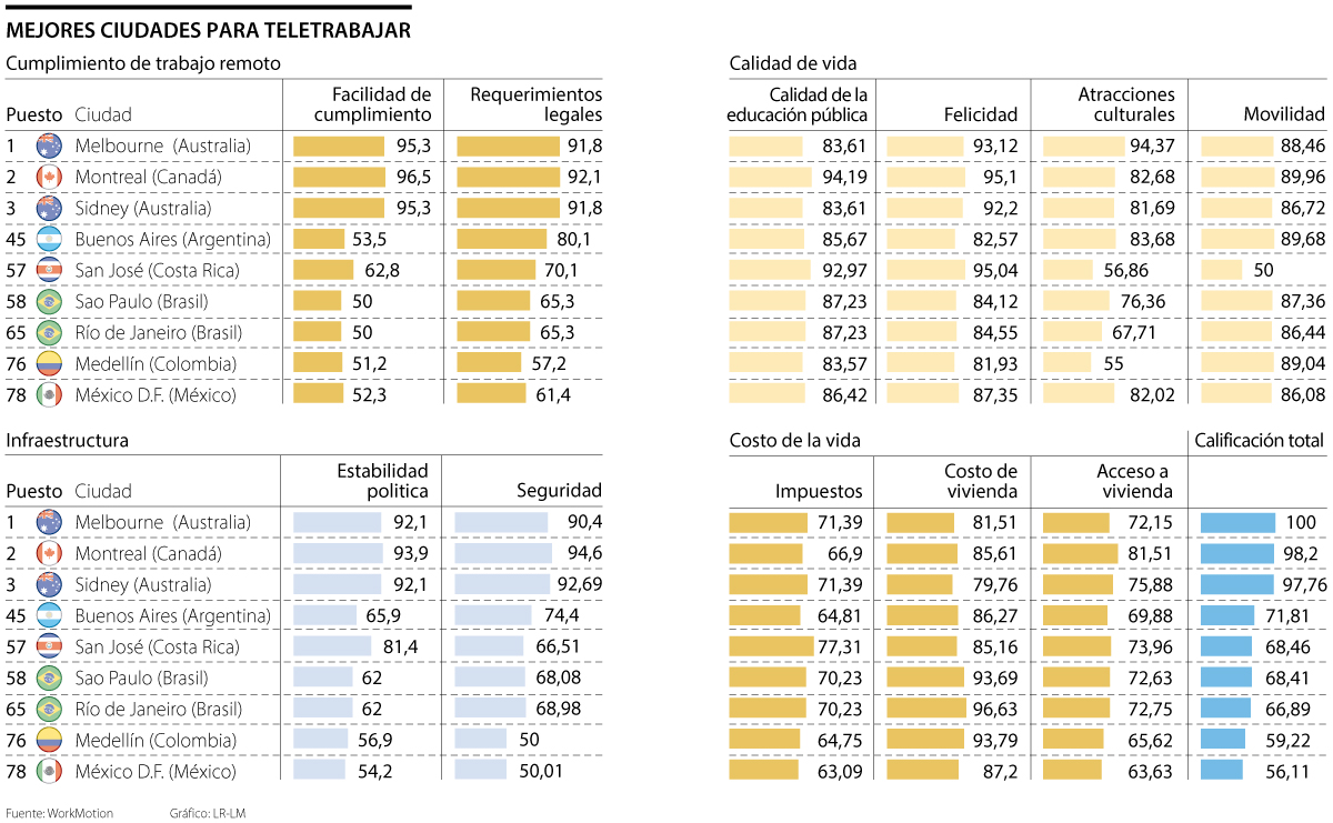 Además, se califican en una escala de 0 a 100 elementos como la facilidad para cumplir con el trabajo de forma remota, los requerimientos legales, impuestos, costo de vivienda, calidad de vida, entre otros.