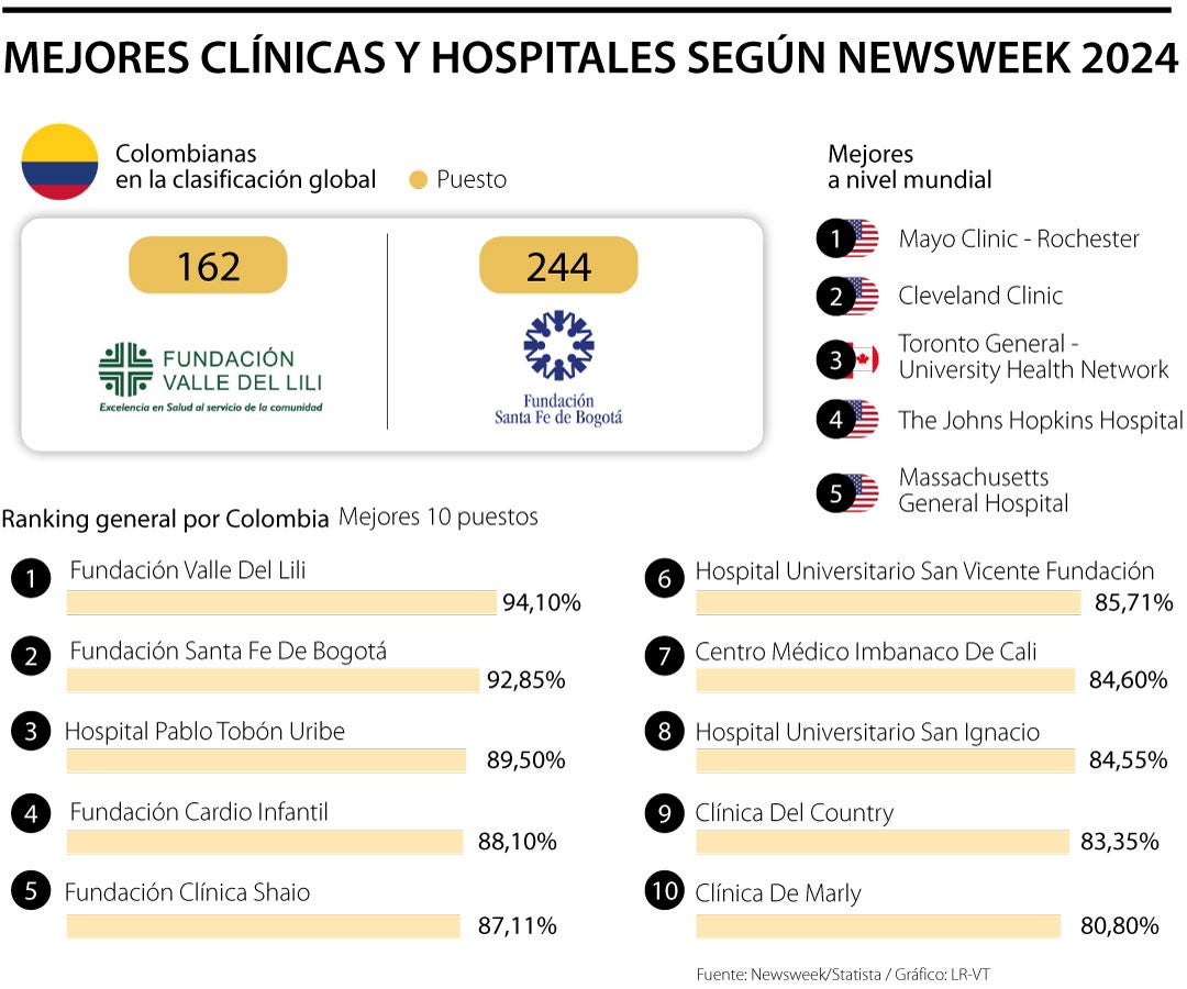Fuera del grupo general del mundo, Newsweek y Statista dedicaron una clasificación separada para Colombia. Además de las dos instituciones anteriores, aparecen nuevos nombres, en el tercer lugar, por ejemplo, con 89,50% llegó el Hospital Pablo Tobón Uribe, de Medellín; y la cuarta y quinta casilla, respectivamente, están la Fundación Cardio Infantil (88,10%) y la Fundación Clínica Shaio (87,11%), ambas en la capital.