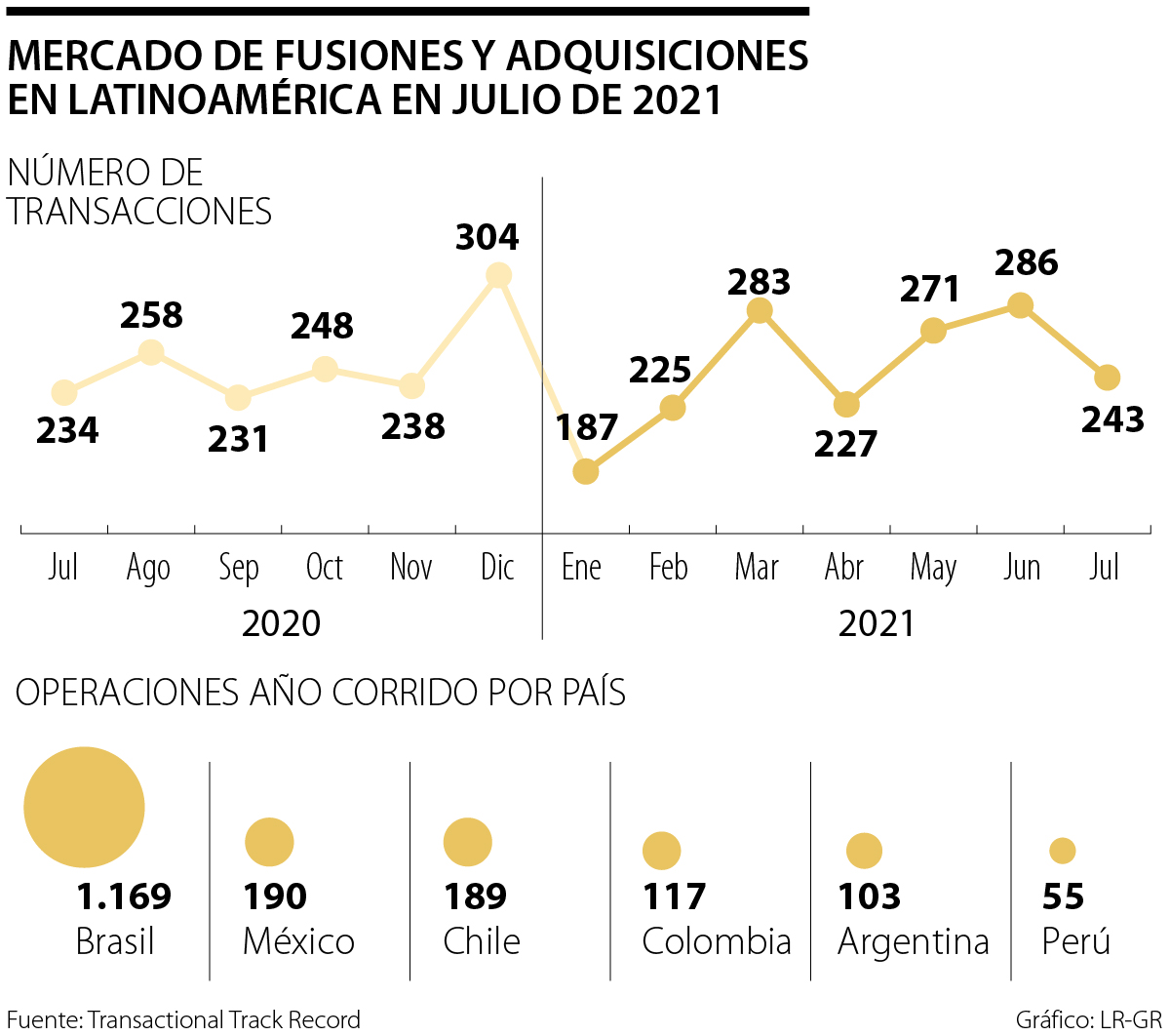 Si se analizan los datos de los primeros siete meses del año desagregados por países, el ranking lo lidera Brasil, con 1.169 operaciones por un valor de US$52.936 millones. Le siguió México que, muy por debajo, registró 190 transacciones por US$12.211 millones; luego Chile, con 189 operaciones por US$11.453 millones; Colombia, con 117 a un costo de US$4.691 millones; y por último, Argentina, junto a Perú, con 103 y 55 transacciones, respectivamente.
