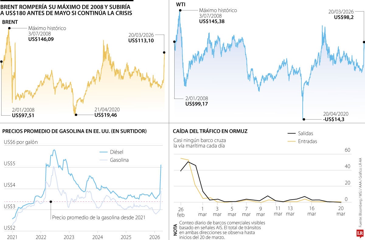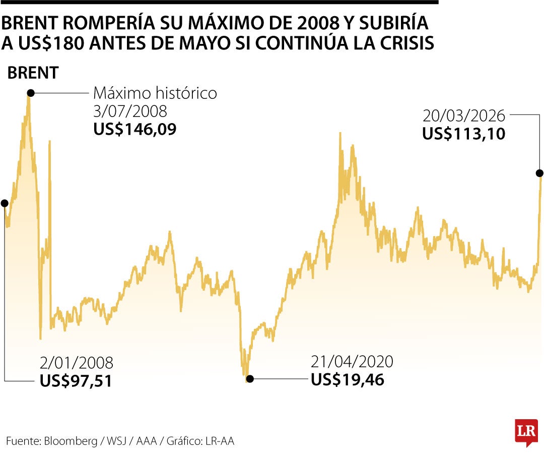 El mercado ya está en tensión. Desde que comenzó la guerra el 28 de febrero, los precios del crudo han aumentado cerca de 64%, impulsados por ataques directos a infraestructura energética y por el colapso de rutas clave de transporte. El brent llegó a tocar los US$119 por barril, acercándose rápidamente a su máximo histórico de US$146,09 alcanzado en 2008. Sin embargo, lo que antes parecía un techo ahora es visto como un punto de paso. Analistas de la consultora Wood Mackenzie van más allá. “Un precio de US$200 por barril no es algo imposible en 2026”.