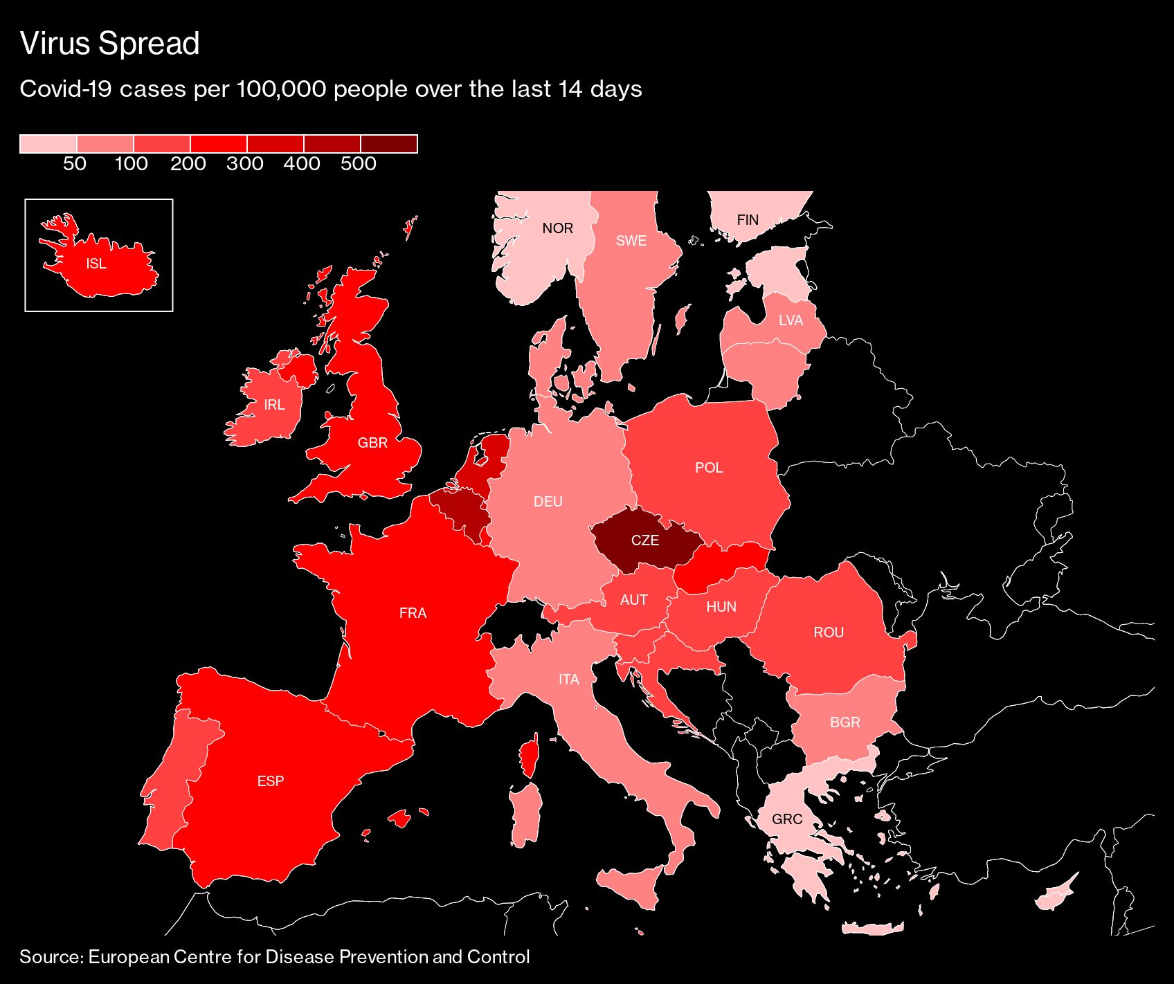 El promedio móvil de siete días de nuevas infecciones en Francia aumentó el martes por undécimo día a 17.387, el más alto desde el inicio del brote. Después de poner en alerta máxima a seis ciudades, incluida París, el presidente francés, Emmanuel Macron, aparecerá en la televisión nacional más tarde el miércoles y puede anunciar restricciones adicionales.