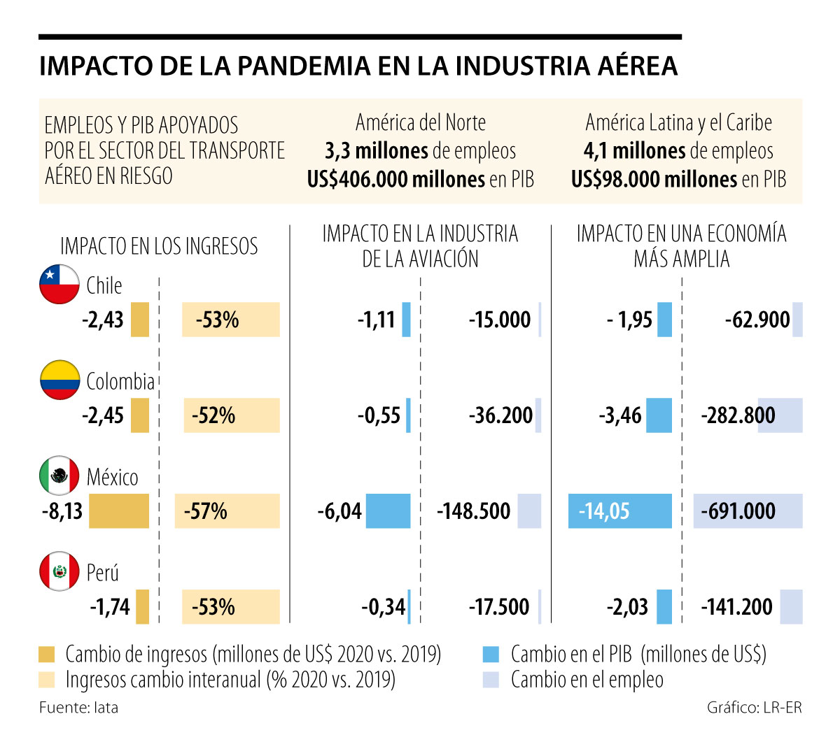 Esto situación está poniendo en riesgo 3,3 millones de empleos y US$406.000 millones en PIB en América del Norte y 4,1 millones de empleos y US$98.000 millones en PIB en América Latina y el Caribe, según Cerda que también resaltó que, por ejemplo, en Colombia, se va a registrar una disminución en los ingresos del sector de 52% este año.