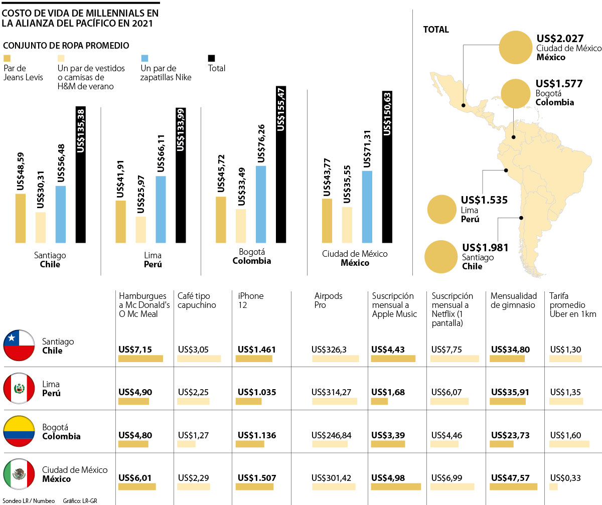 Tras un año de pandemia, el consumo millennial y los precios de varios artículos de su consumo general han cambiado drásticamente, por ello, a través de un sondeo realizado por LR, se logró determinar que entre los países de la Alianza del Pacífico, México es el territorio que le cuesta más a esta población, pues entre los artículos analizados se totalizó una cifra de US$2.207, superior a la de Chile, Perú y Colombia.
