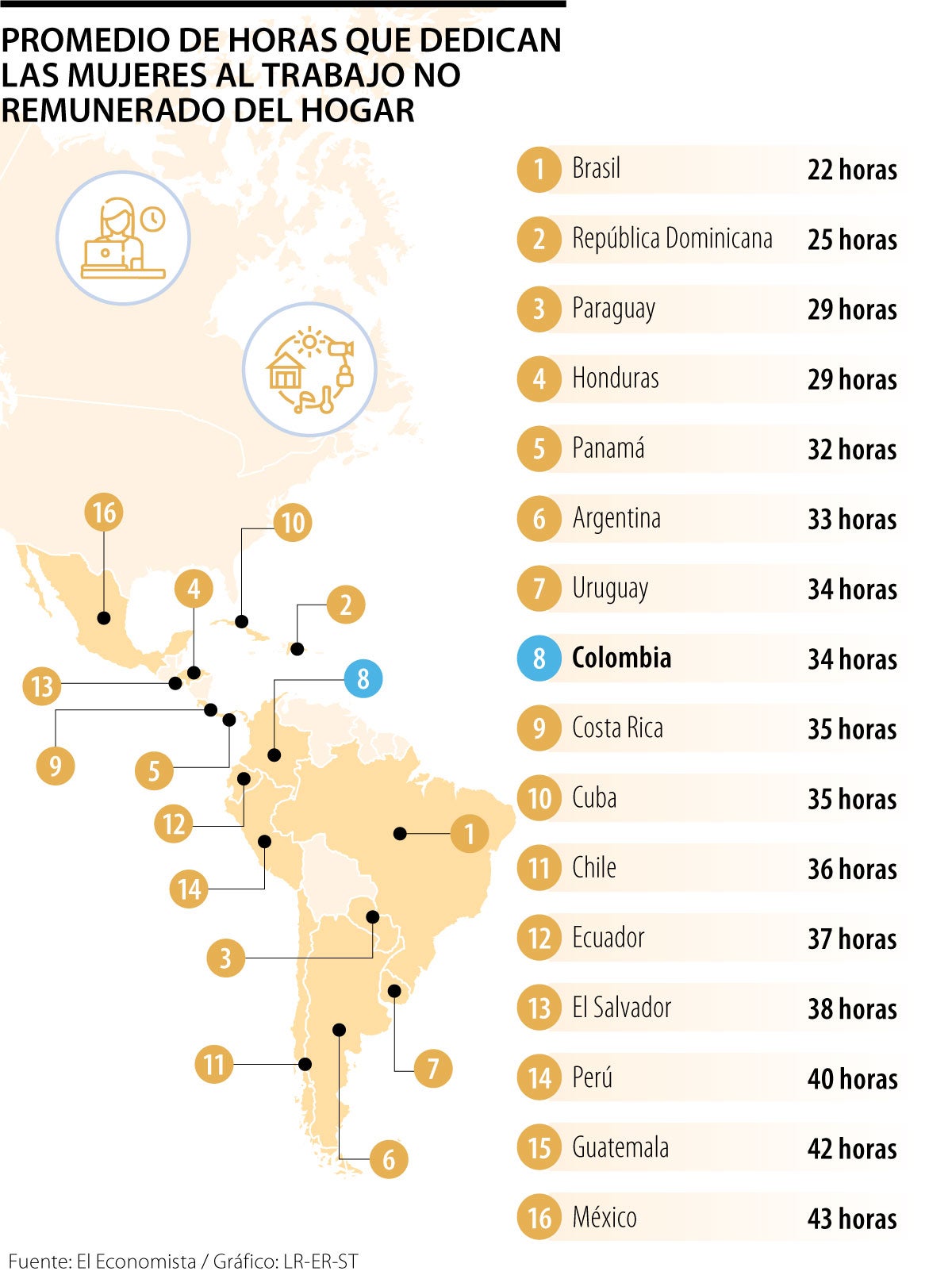 De acuerdo con un análisis del Instituto Mexicano para la Competitividad (Imco), las mujeres brasileñas son las que menos destinan tiempo al trabajo no remunerado en este comparativo, con un promedio de 22 horas semanales, seguidas de las dominicanas, con 25 horas, y las paraguayas y las hondureñas, con 29 horas en ambos casos.