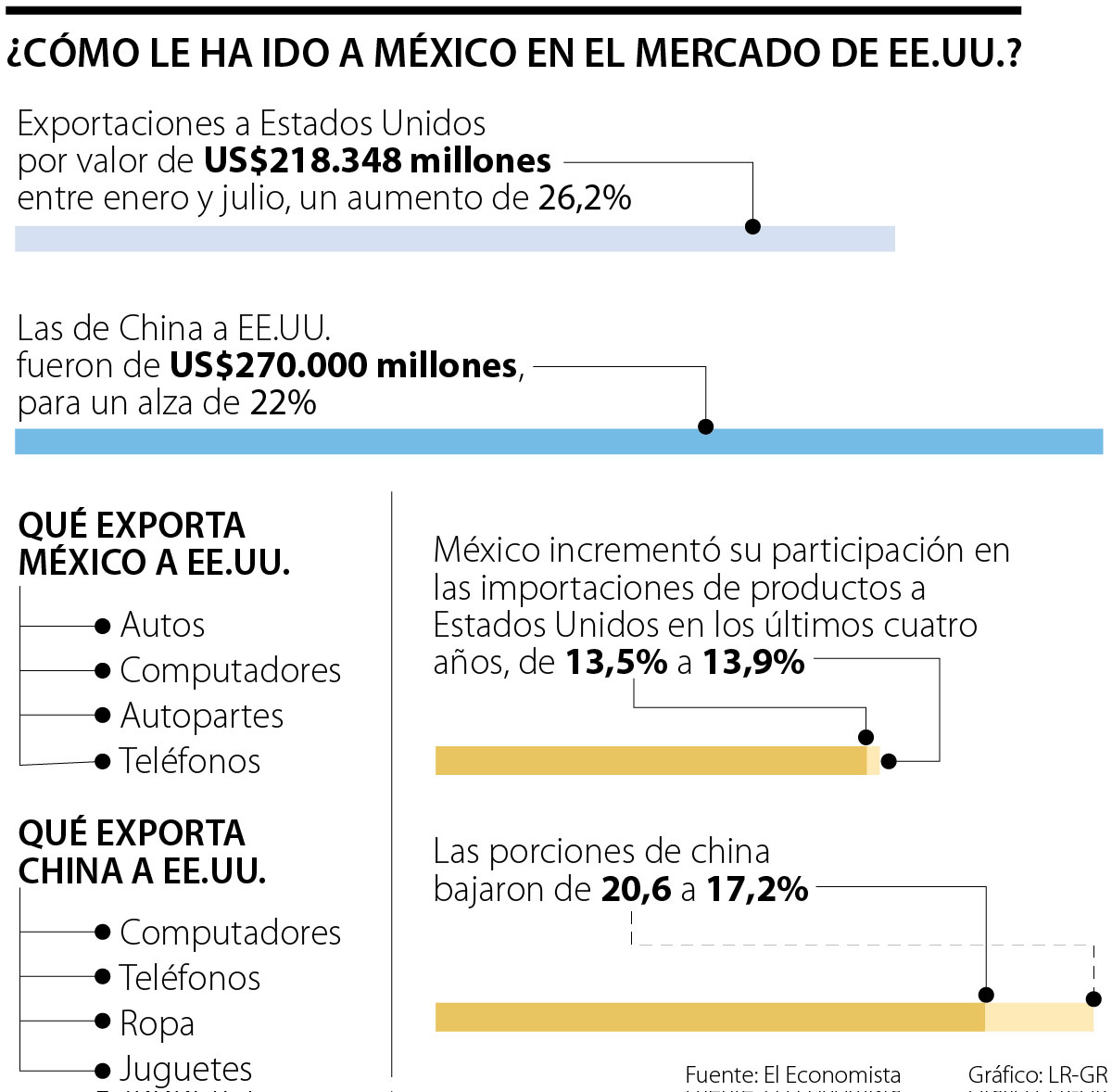 México incrementó su participación en las importaciones de productos a Estados Unidos en los últimos cuatro años, de 13.5 a 13.9%, mientras que las porciones de China bajaron de 20.6 a 17.2%, considerando los periodos de enero a julio, según datos de la Oficina del Censo de Estados Unidos.