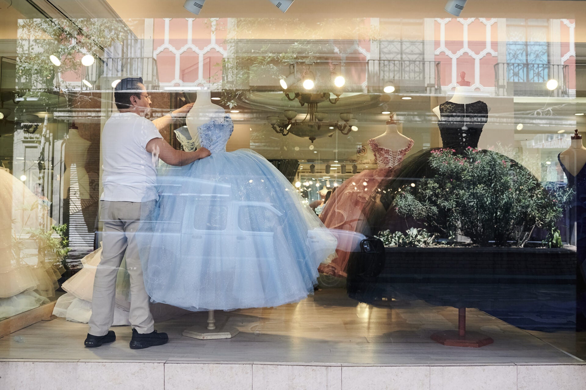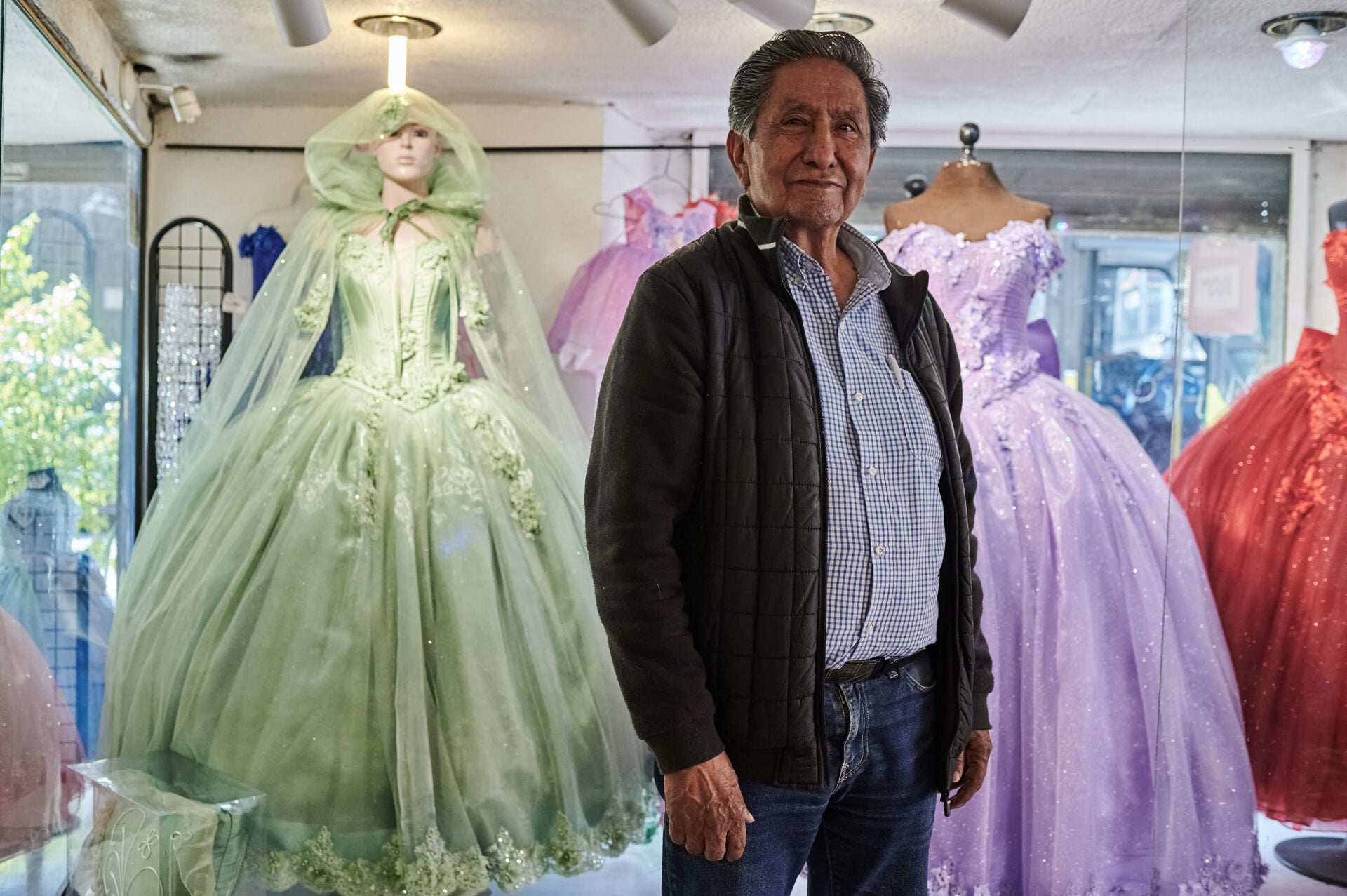 Durante décadas, las modistas mexicanas se han congregado en una sola calle del centro colonial de la capital, y muchas instalan escenarios en sus tiendas para sesiones de modelaje. Los comerciantes confeccionan los vestidos en las inmediaciones, utilizando principalmente telas mexicanas.