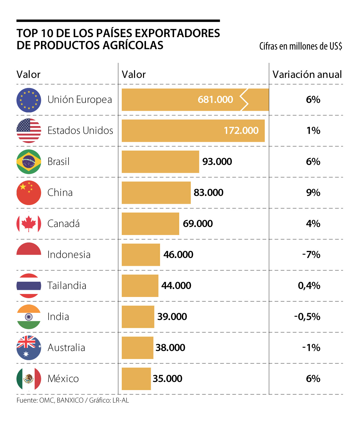En el año pasado, los siete principales exportadores de productos agroindustriales se mantuvieron sin cambios, liderados por la Unión Europea, Estados Unidos y Brasil. India subió al octavo lugar y Australia bajó al noveno.