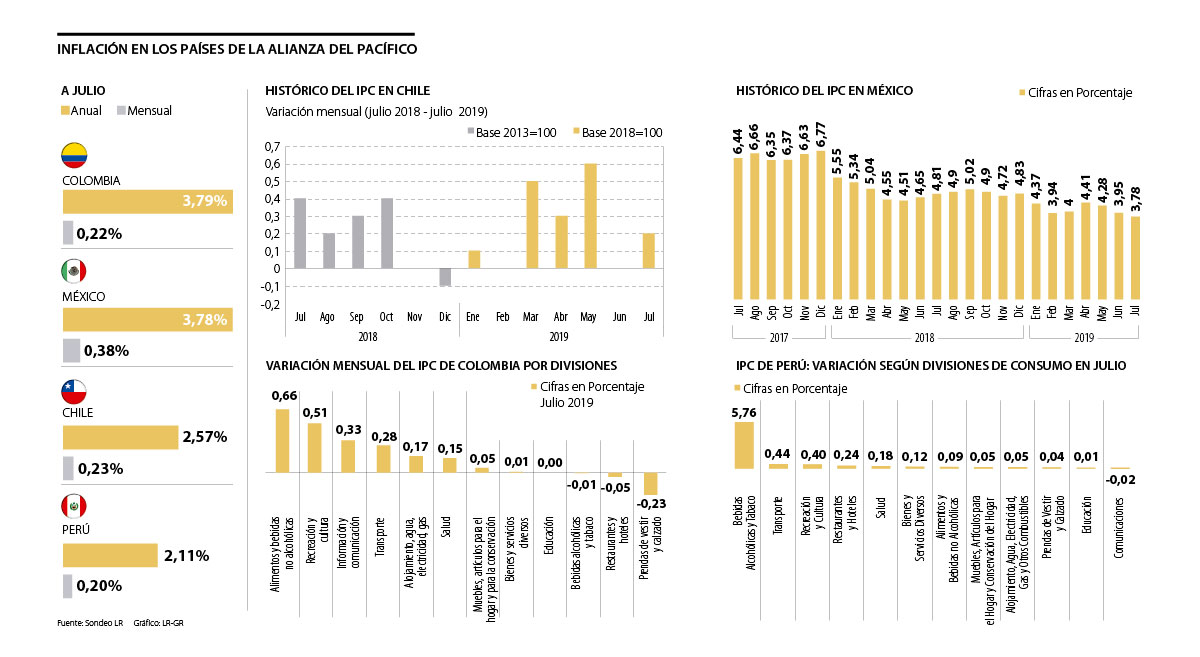 En segundo lugar se ubicó Chile, donde el costo de vida aumentó 0,23% en julio; le siguió Colombia, con un índice de precios al consumidor mensual de 0,22%, y el que tuvo un menor aumento de la inflación fue Perú, con 0,20%.