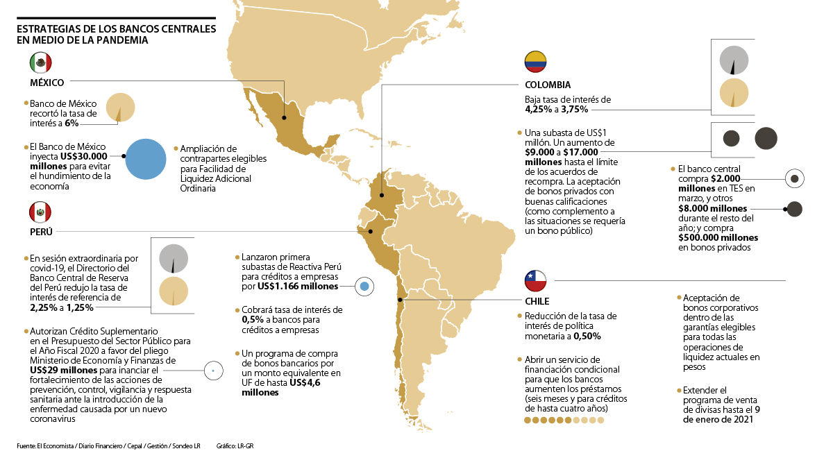 Los bancos centrales de estas naciones no solo han anunciado recortes en sus tasas de interés para proveer de liquidez y preservar el funcionamiento del sistema financiero, sino que también han informado otro tipo de estrategias como subastas, compra de TES, venta de divisas y demás planes que tienen como fin mitigar el choque en el bolsillo de los ciudadanos producto de las medidas que han adoptado los gobiernos para contener el virus.
