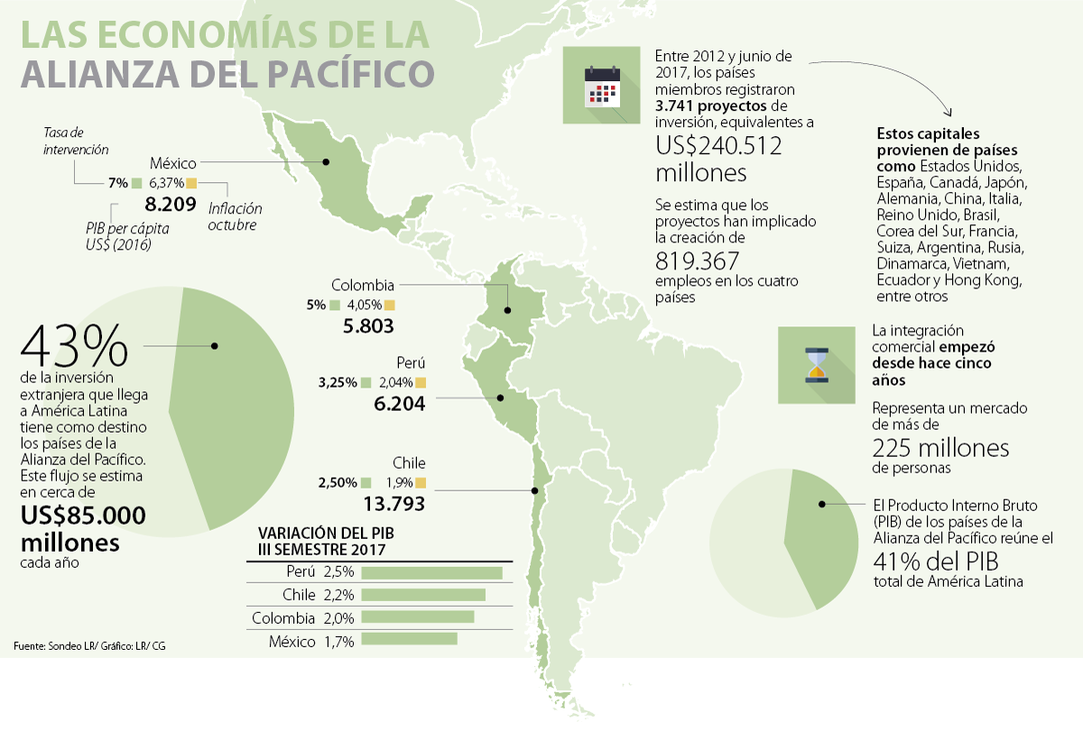 En contraste, México tiene la inflación y la tasa de intervención del banco central más altas de los países miembros de la Alianza del Pacífico, pues estas son de 6,37% y 7% respectivamente. En cambio, en Chile la inflación está en 1,9% y la tasa de interés, en 2,5%; mientras que en Colombia la inflación es de 4,05% y la tasa de intervención está en 5%. La economía chilena tuvo un crecimiento de 2,2%, mientras que la de Colombia llegó a 2% mostrando síntomas de recuperación, aunque no los suficientes para que la economía local crezca más allá de 1,8%, según las estimaciones oficiales.