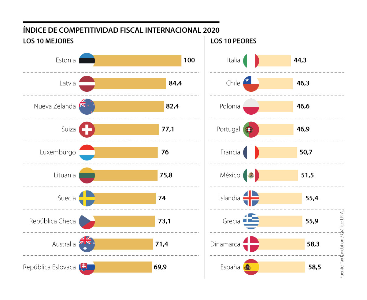 La entidad evaluó la política tributaria con las tasas impositivas, la estructuración de los impuestos, los impuestos corporativos, los impuestos sobre la renta de las personas físicas, los impuestos al consumo, impuesto prediales, y el tratamiento de las ganancias obtenidas en el extranjero y puntuó a los países de 1 a 100.