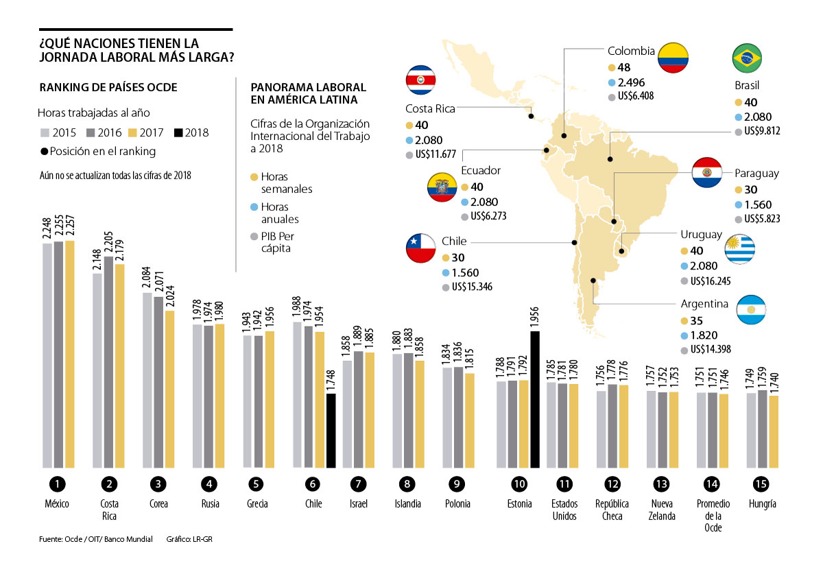 En el ranking de los miembros de la organización con peores jornadas laborales también está Corea, con 2.024 horas al año, Rusia, con 1.980, Grecia, con 1.956 y Chile, con 1.954. Estas cifras se ubican por encima del promedio general, pues según el organismo internacional, el término medio es de 1.763 horas al año, un poco por debajo de lo que se presenta en Estados Unidos, en donde se trabaja cerca de 1.783 horas.