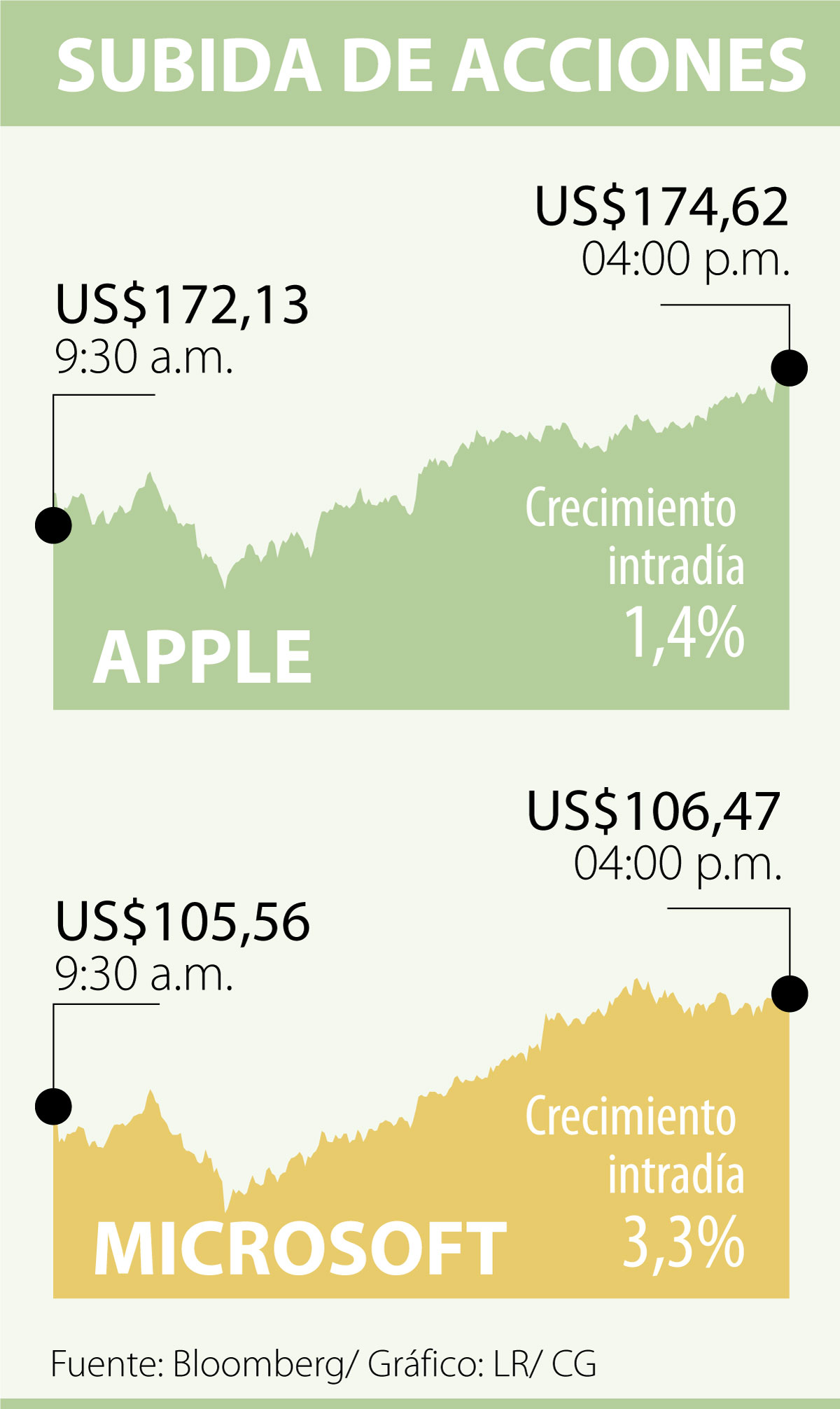 Pese a lo anterior, el cierre de la jornada fue positivo en materia del valor de las acciones. En la bolsa de Nueva York, Apple cerró a US$174,62, con un crecimiento de 1,2%, mientras que Microsoft subió 3,32% con un valor de US$106,47. A su vez, Apple recuperó la primera posición, pues su capitalización bursátil llegó a US$828.640 millones, mientras que la firma que fundó Bill Gates se ubicó en US$822.900 millones.