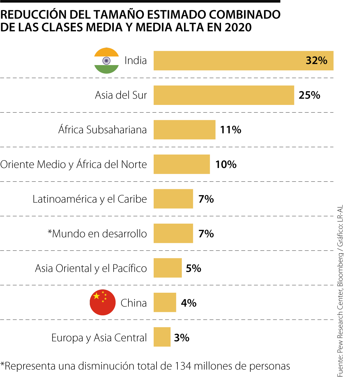 China, que según la definición de Pew alberga a un tercio de la clase media mundial, parece estar recuperándose rápidamente, pero muchos países en desarrollo enfrentan perspectivas económicas reducidas.