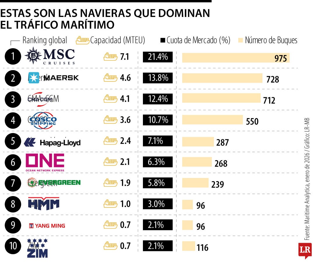 De acuerdo con estimaciones de Maritime Analytica para enero de este año, Meditarranean Shiping Company, Maersk y CGA CGM controlaban 47,6% de la capacidad marítima mundial, mientras que solo 10 empresas controlan aproximadamente 84,7% y operaban más de 4,500 barcos de transporte marítimo.