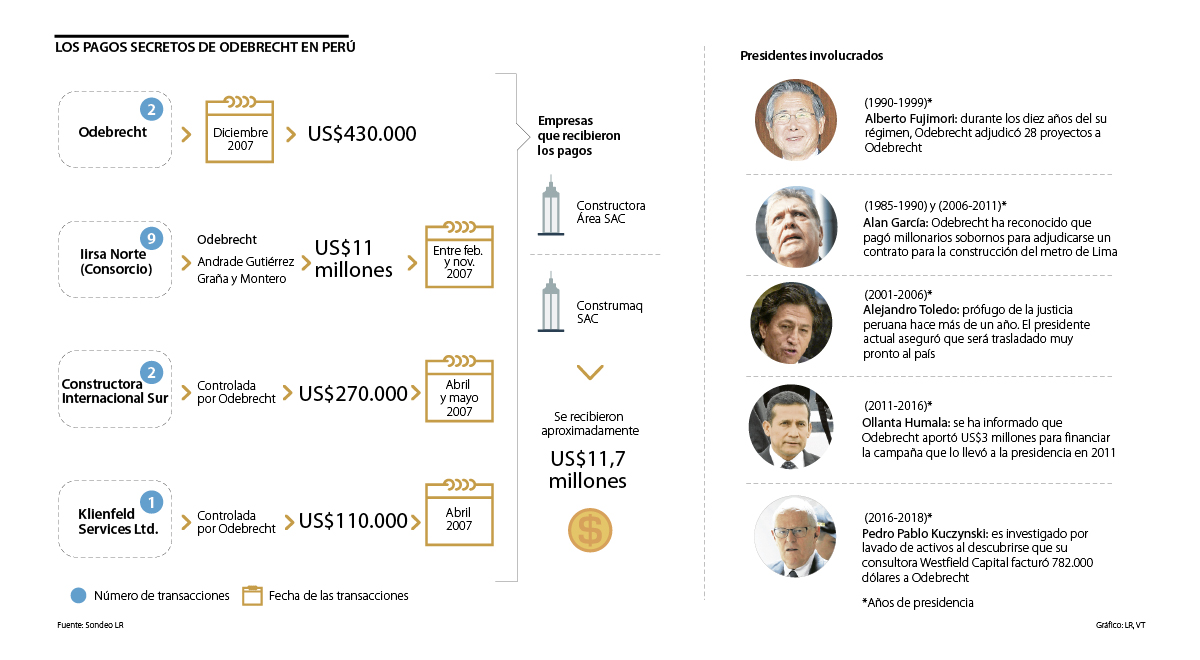 Hasta el momento, ya son dos los expresidentes peruanos capturados como medida preventiva (Alberto Fujimori y Pedro Pablo Kuczynski), un exmandatario prófugo de la justicia (Alejandro Toledo), otro con privación de libertad (Ollanta Humala) y el quinto, Alan García, ayer optó por suicidarse antes de ser arrestado y ser sometido a un juicio. Con estos personajes, Perú ha sido uno de los peores sinsabores que ha dejado el entramado de corrupción de la brasilera Odebrecht en la región, la cual aceptó en diciembre de 2016, según publicó el periódico El Comercio, que pagó más de US$ 29 millones (la cifra llega hasta US$45 millones) en sobornos a funcionarios, empresarios y políticos peruanos, y aportes a campañas electorales.