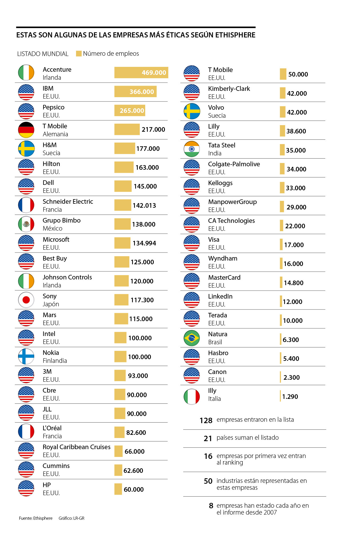 El informe no publica un ranking como tal, sino que agrupa a las compañías en un sistema de clasificación propio llamado Ética Conciente de Ethisphere.