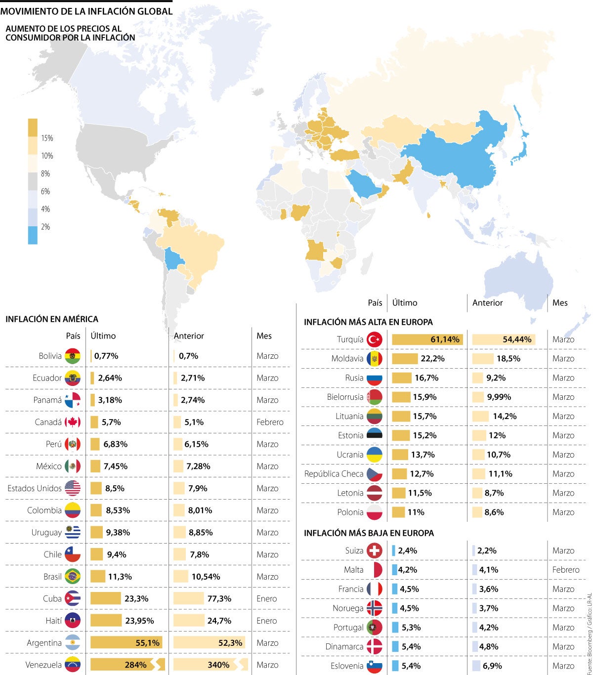 En América Latina, los reportes de inflación ubican a Venezuela como el país con la inflación más alta a nivel de 284%, que curiosamente bajó frente a febrero de una tasa de 340%. Sigue Argentina, allí subió a 55,1% en el tercer mes del año, de 52,3% en el que estaba 30 días antes. Y el top cinco lo complementan Haití (23,9%), Cuba (23,3%) y Brasil (11,3%).