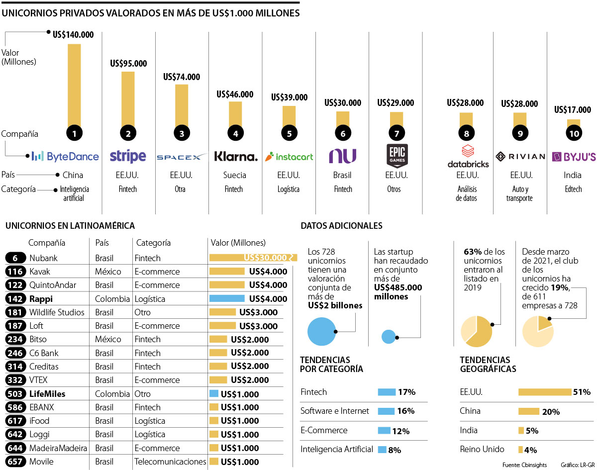 Según el listado publicado por CBInsights, en el mundo hay 728 unicornios que superan esa valoración, entre los que están la brasileña Nubank, en el top 10, y otras 15 compañías latinas, entre ellas dos colombianas. En conjunto, las empresas tienen una valoración que supera los US$2 billones.