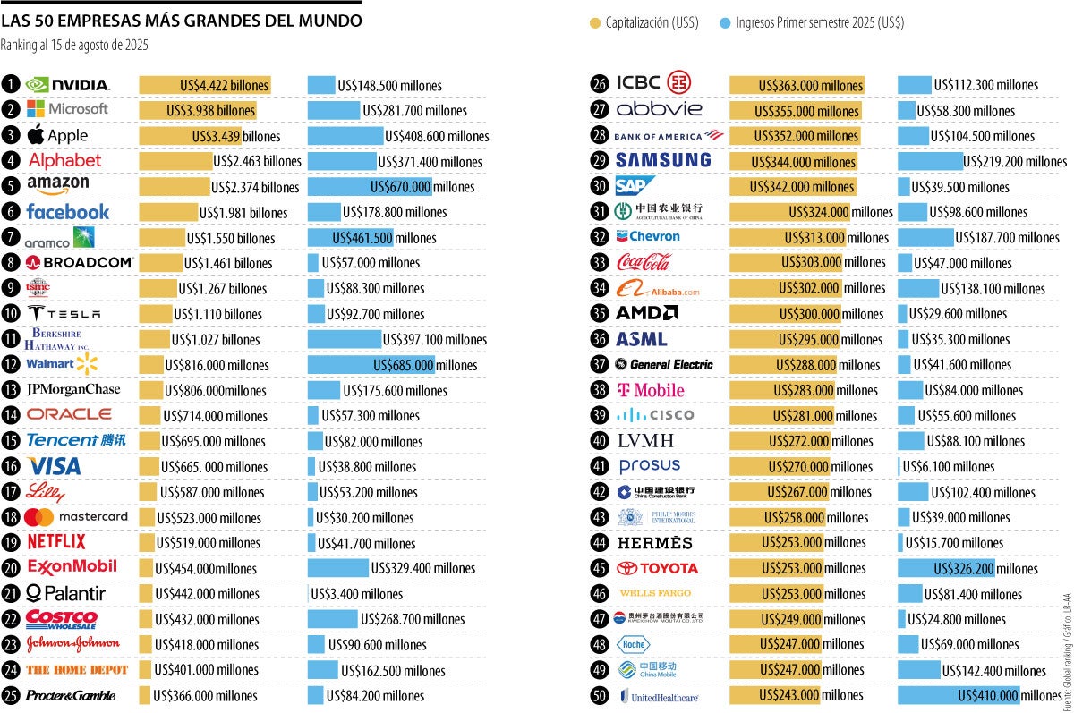 Más allá del top 20, la lista hasta las 50 empresas más valiosas del planeta continúa estando dominada por Estados Unidos, que concentra más de 60% de las posiciones. Además de las ya mencionadas, figuran compañías como Johnson & Johnson, Procter & Gamble, Mastercard, ExxonMobil, todas con un gran peso en diferentes sectores del mercado. En Asia destacan Toyota (Japón), Samsung (Corea del Sur) y Alibaba (China), mientras que en Europa se consolidan nombres como Nestlé (Suiza), Roche (Suiza), Novo Nordisk (Dinamarca) y Asml (Países Bajos), empresas que en conjunto muestran el músculo global en alimentación, salud y semiconductores.