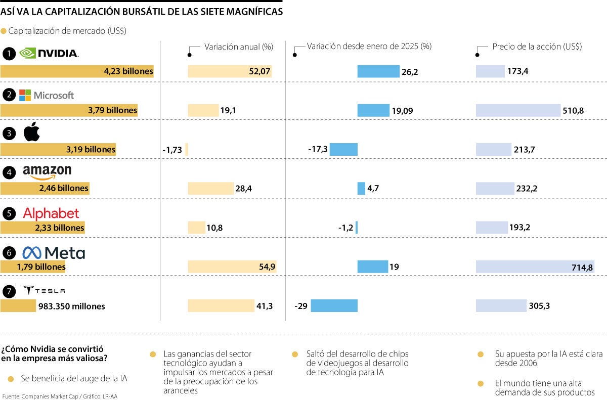 Este año ha sido un vaivén para las empresas más poderosas del mundo. Las siete magníficas han tenido que demostrar su hegemonía en medio de los cambios arancelarios y las tensiones geopolíticas. Nvidia se convirtió en la empresa más valiosa del mundo seguida de Microsoft y Apple, mientras que otras compañías como Tesla y Apple reportaron contracciones en su valor en Bolsa.
