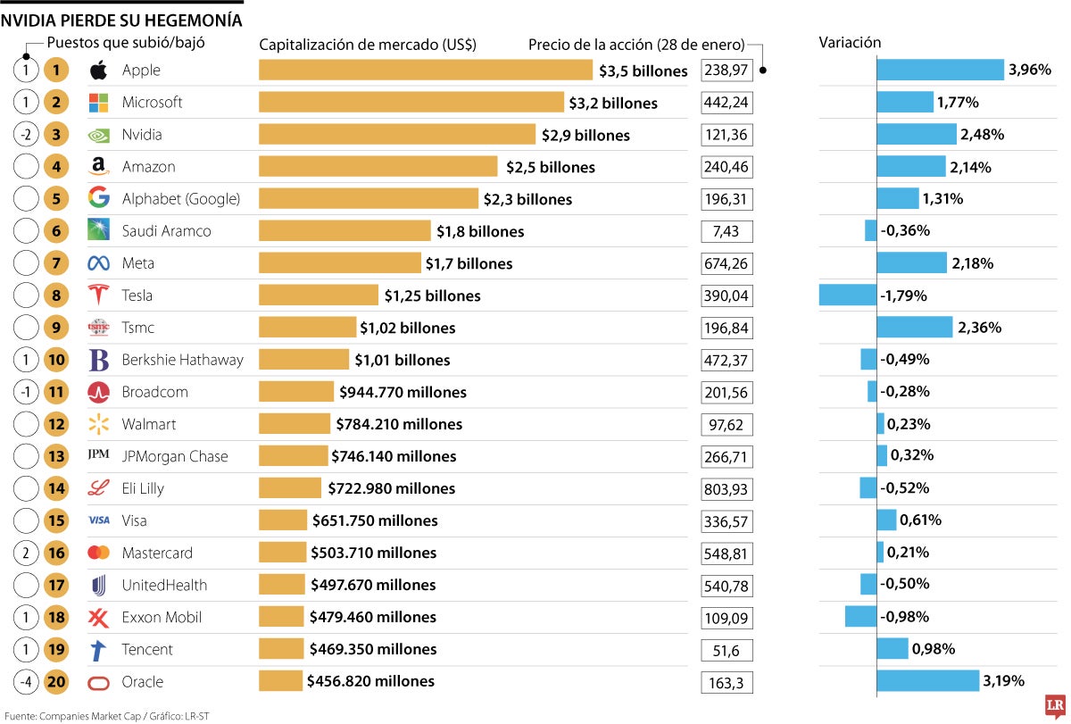 Los últimos dos días han sido claves para la reorganización del ranking de las empresas más valiosas del mundo. La llegada de la inteligencia artificial china DeepSeek sacudió los mercados e hizo que Nvidia perdiese hasta US$600.000 millones en capitalización bursátil, cifra que representó una caída de 17% el pasado lunes para el fabricante de chips. Ayer, sin embargo, tuvo una ligera recuperación en los mercados de 7%.