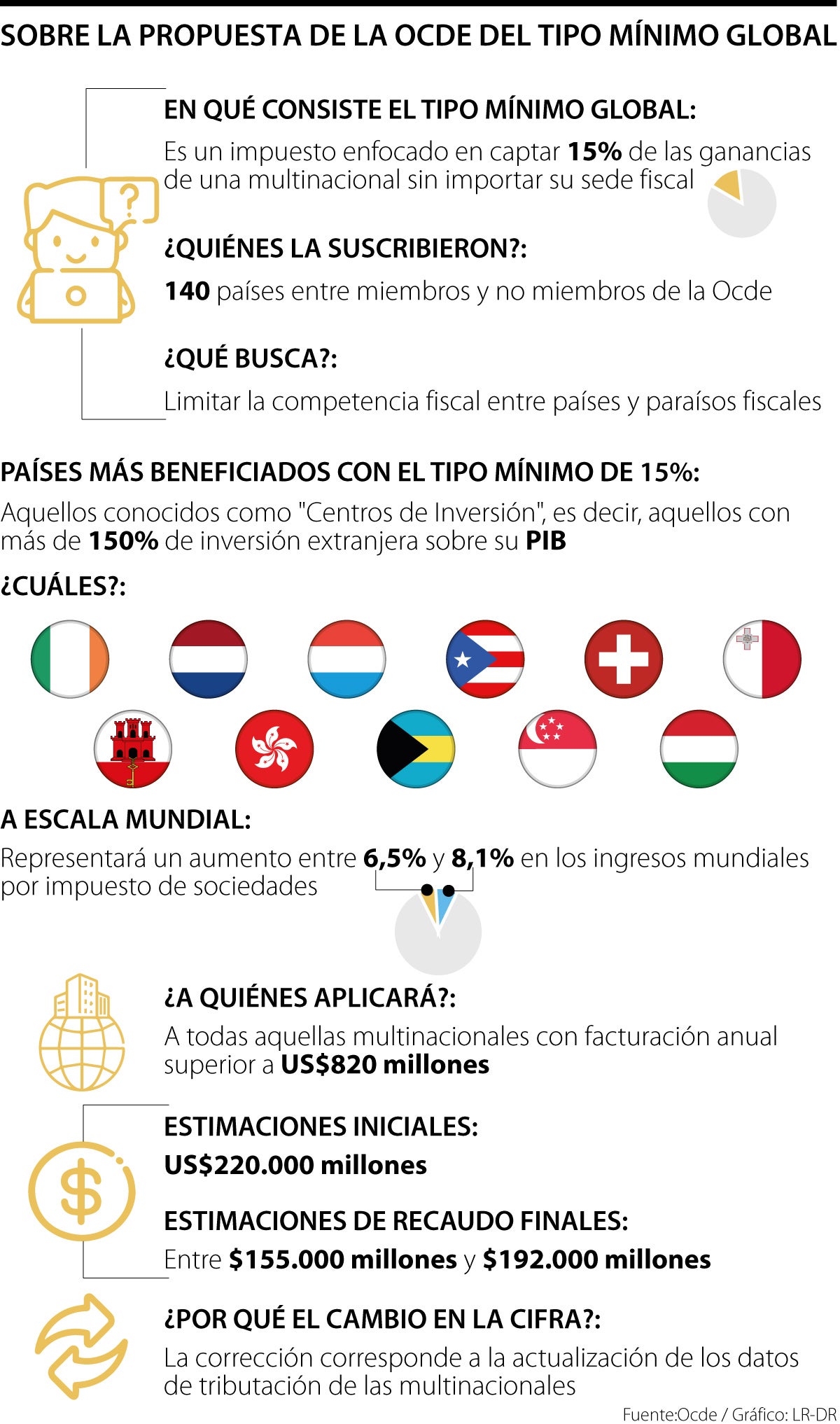 La Organización para la Cooperación y el Desarrollo Económicos, Ocde, publicó una serie de actualizaciones sobre el potencial recaudatorio al que se alcanzaría con un tipo mínimo de sociedades de 15%, una iniciativa global que se pretende poner en práctica en varios países. Ahora, la entidad indica que con este gravamen se percibirían recaudos de entre US$155.000 millones y $192.000 millones de parte de las multinacionales.
