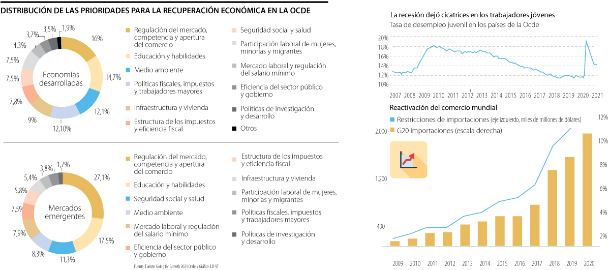 En ese sentido, la Organización para la Cooperación y el Desarrollo Económicos (Ocde), en su más reciente informe ‘Going for Growth 2021: Shaping a Vibrant Recovery’ plantea un listado de 12 nuevas prioridades estructurales de cara al desarrollo de los países de la zona.