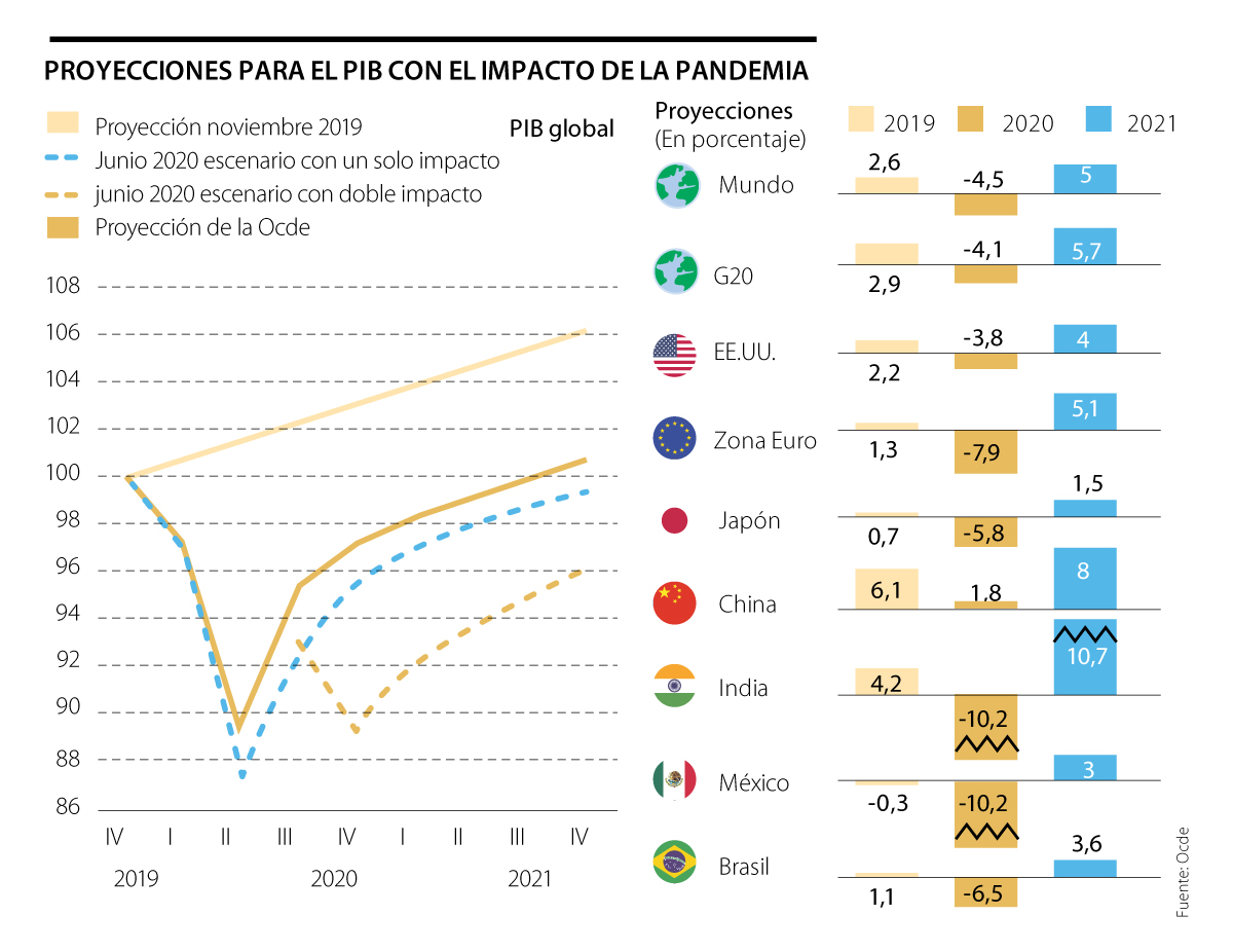 Se han hecho todo tipo de proyecciones frente a la recuperación económica mundial, algunas negativas, y otras un poco más positivas como la de la Organización para la Cooperación y el Desarrollo Económicos (Ocde), en la que estima que el PIB global caería 4,5% este año, pero tendría un avance de 5% para 2021.