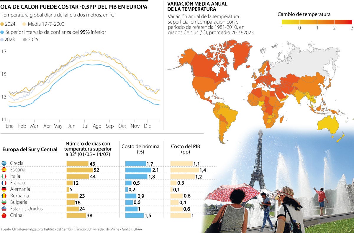 En Europa, las pérdidas de PIB oscilan entre 0,1 puntos porcentuales en Alemania y hasta 1,4 puntos porcentuales en España, donde las temperaturas son unos 10 grados más altas en verano.