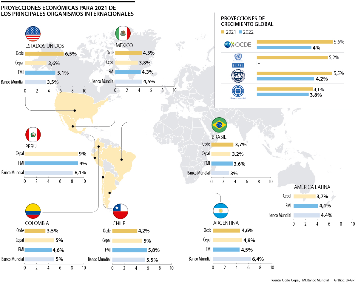 En contraste a lo anterior, la Cepal realizó las proyecciones más austeras de los cuatro organismos internacionales. De acuerdo con esta entidad, el mundo verá un crecimiento económico de 5,2% en 2021, mientras que América Latina y el Caribe llegará hasta 3,7%.